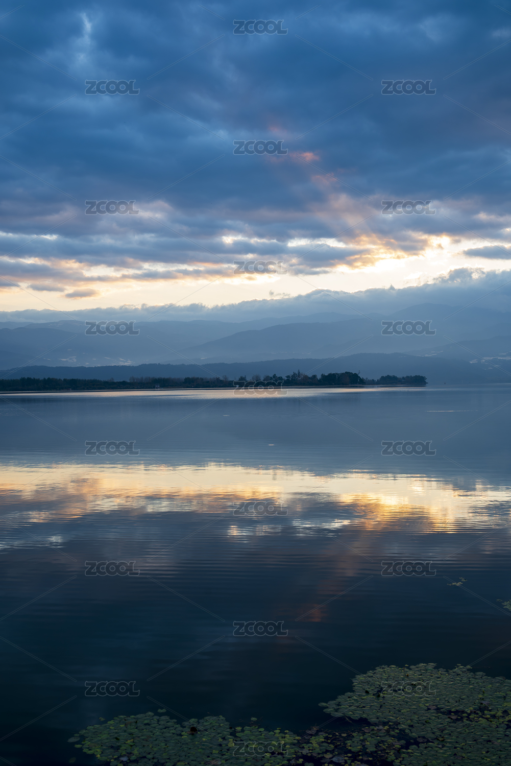 西昌邛海风景区日出时分丁达尔光线映射湖面