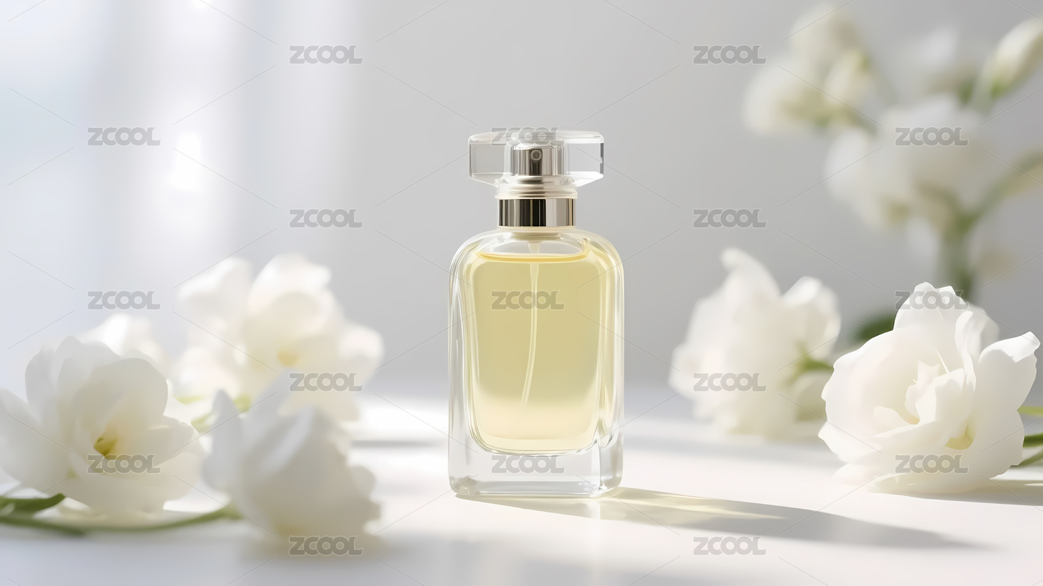 3D透明香水玻璃瓶子鲜花树枝创意广告背景