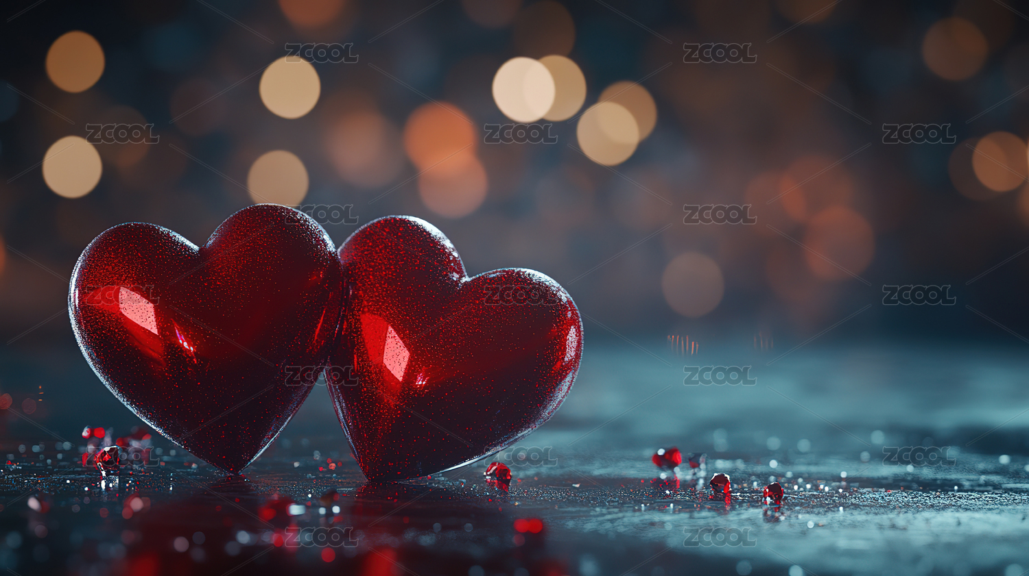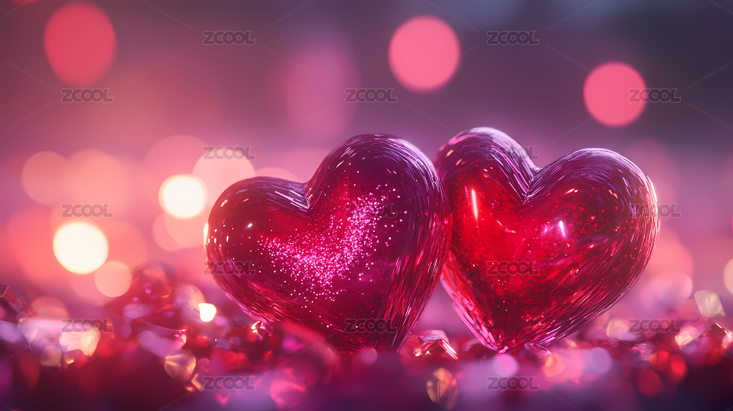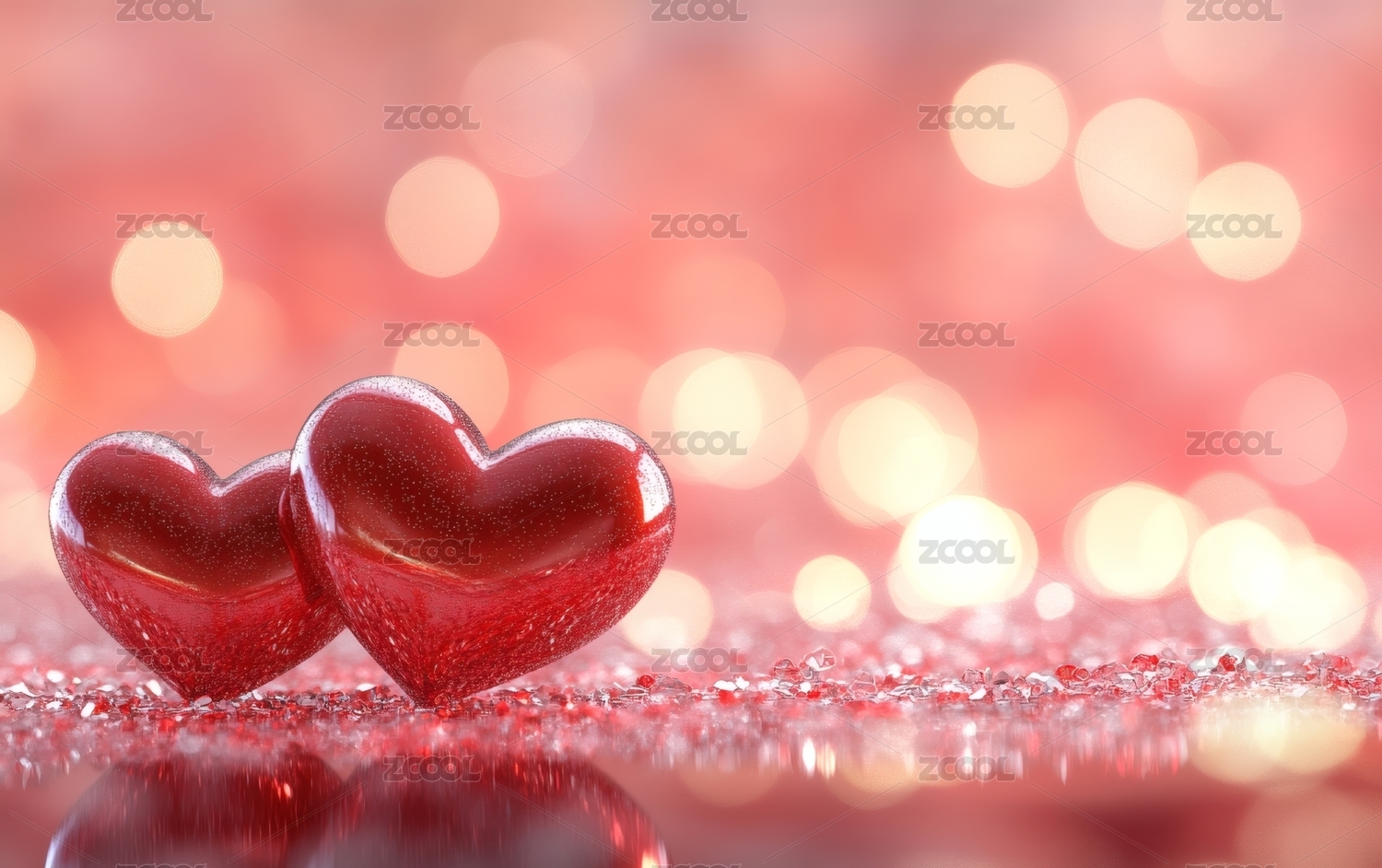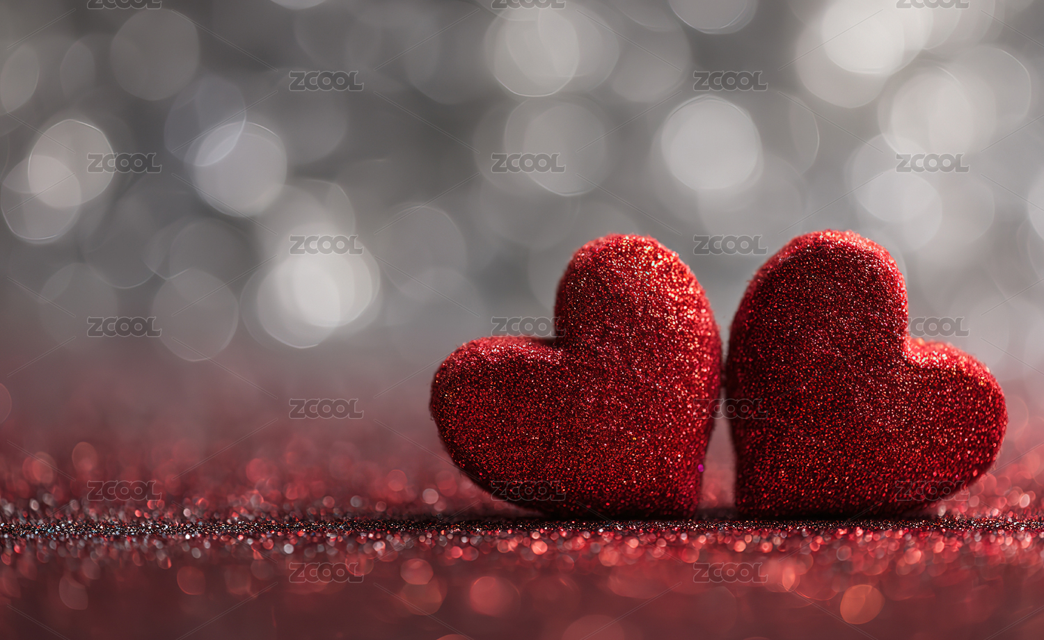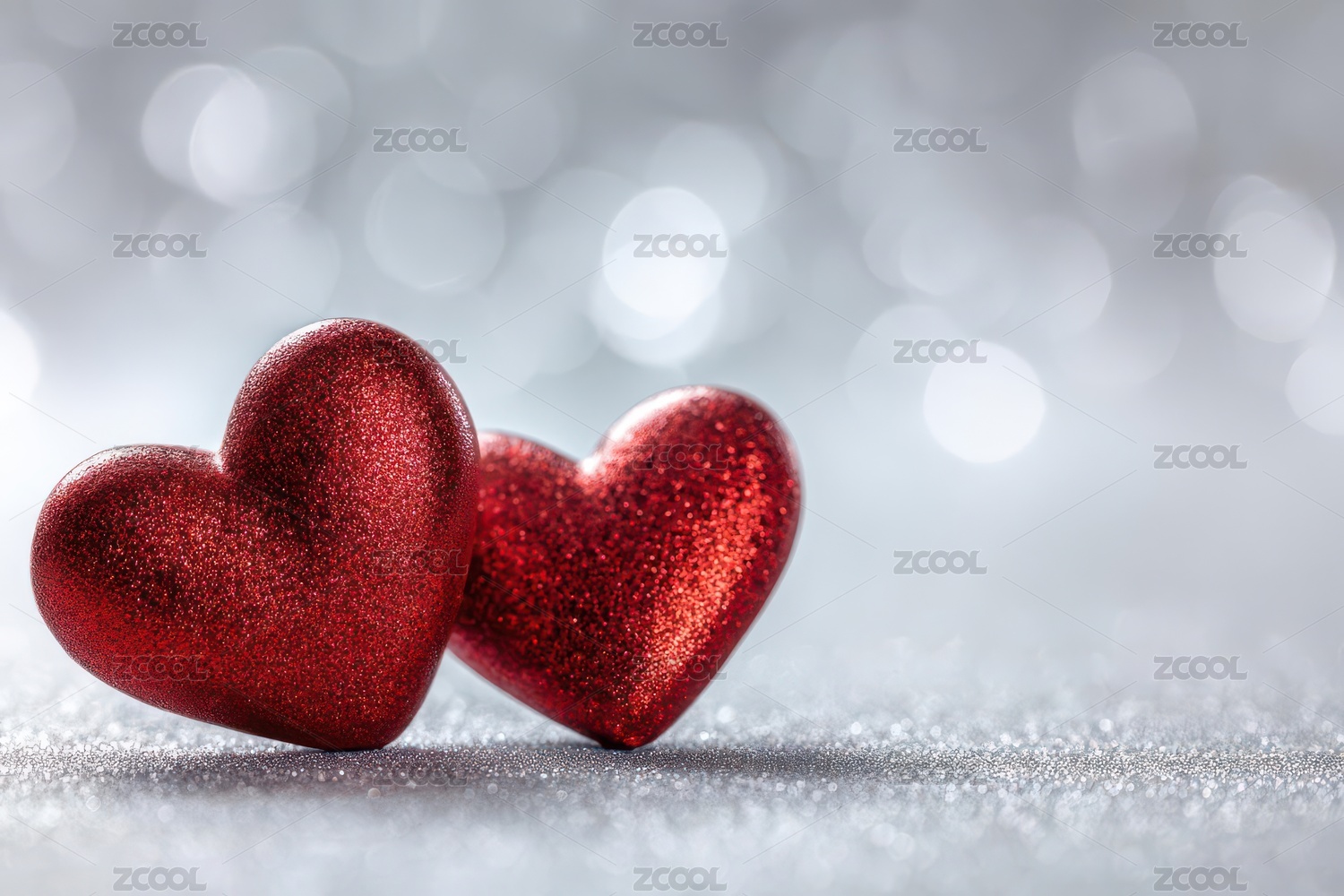 两颗红色闪粉心形并排置于银色闪亮背景上