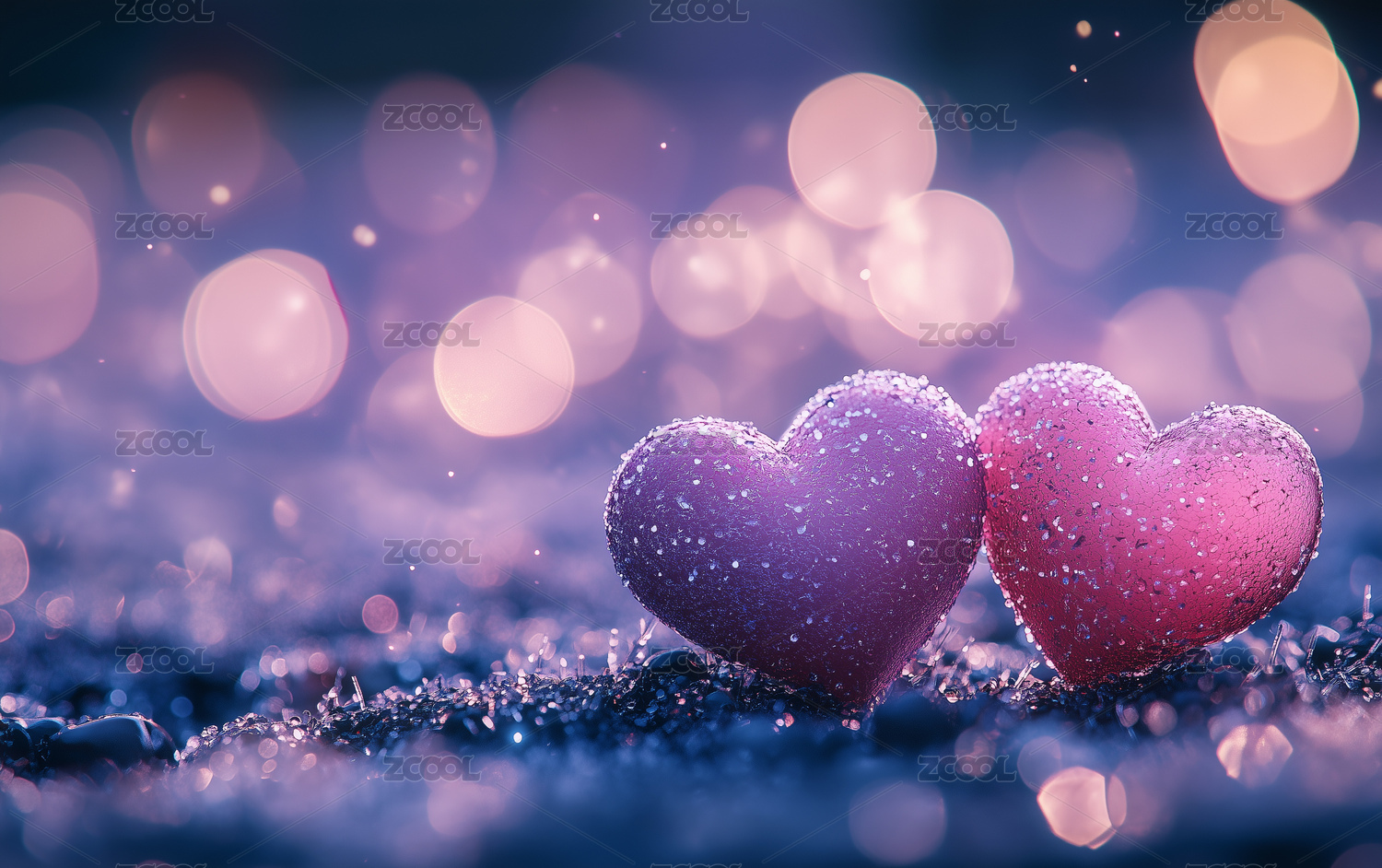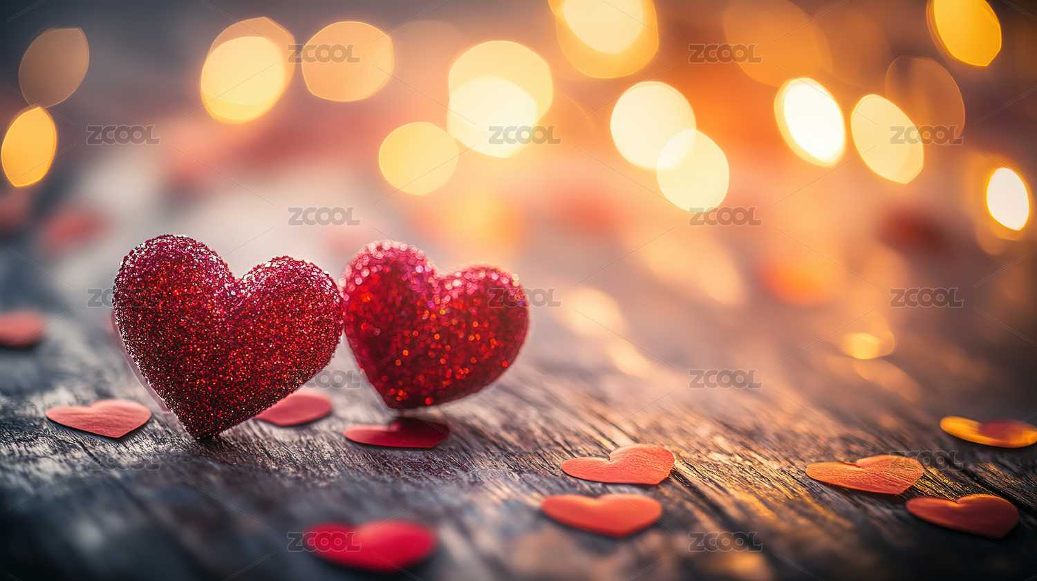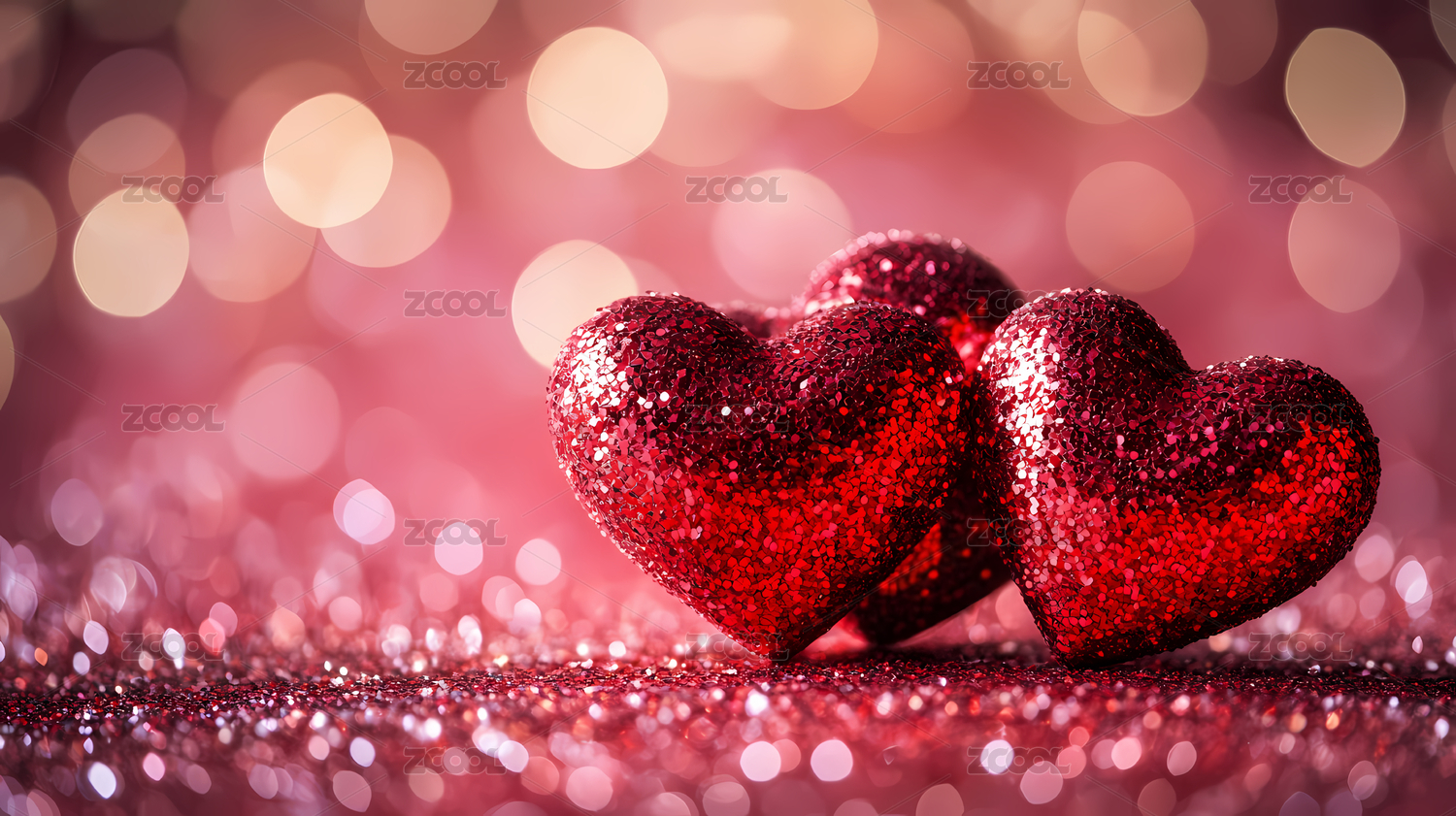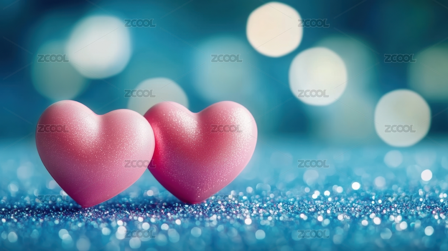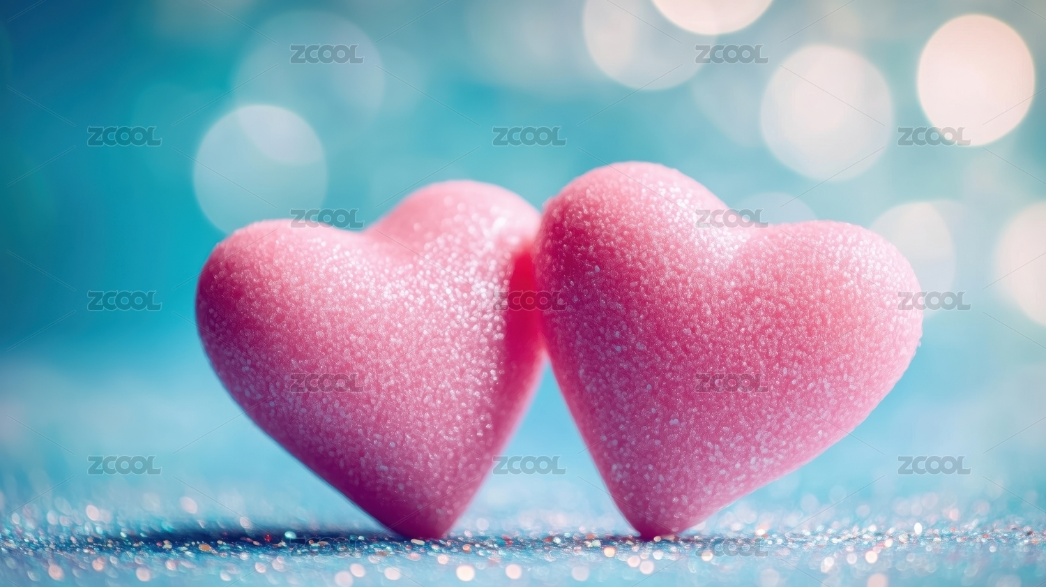 两颗红色闪粉心形并排置于银色闪亮背景上