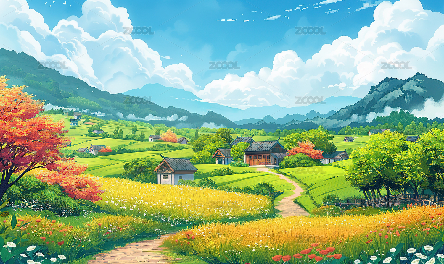 乡村,农村,村庄,田园,风光,插画,绘本,风景,户外,自然