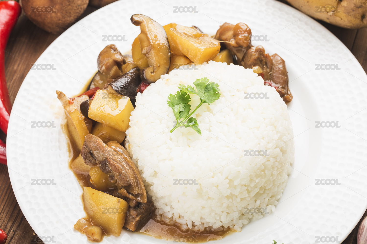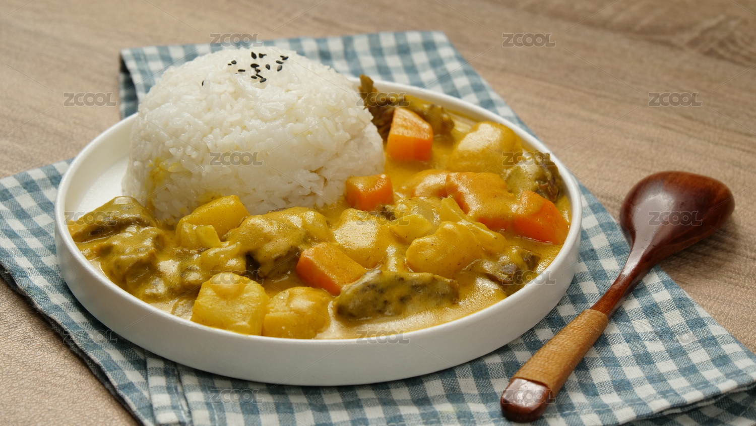 一盘咖喱鸡肉饭摆放在桌面上特写