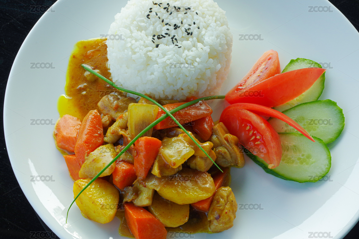 咖喱鸡肉饭配土豆胡萝卜西红柿黄瓜俯视特写