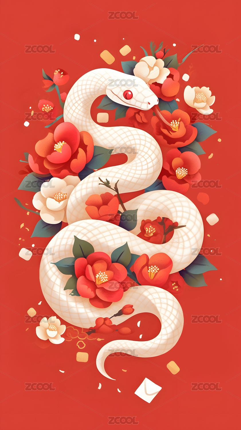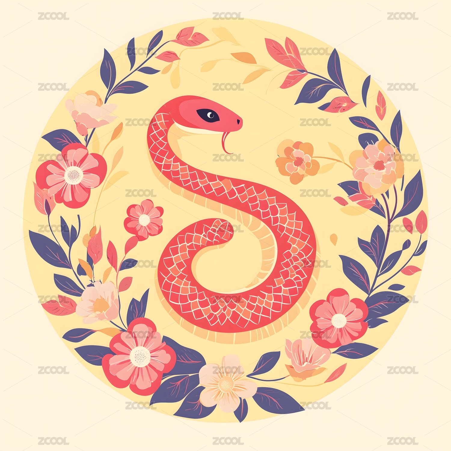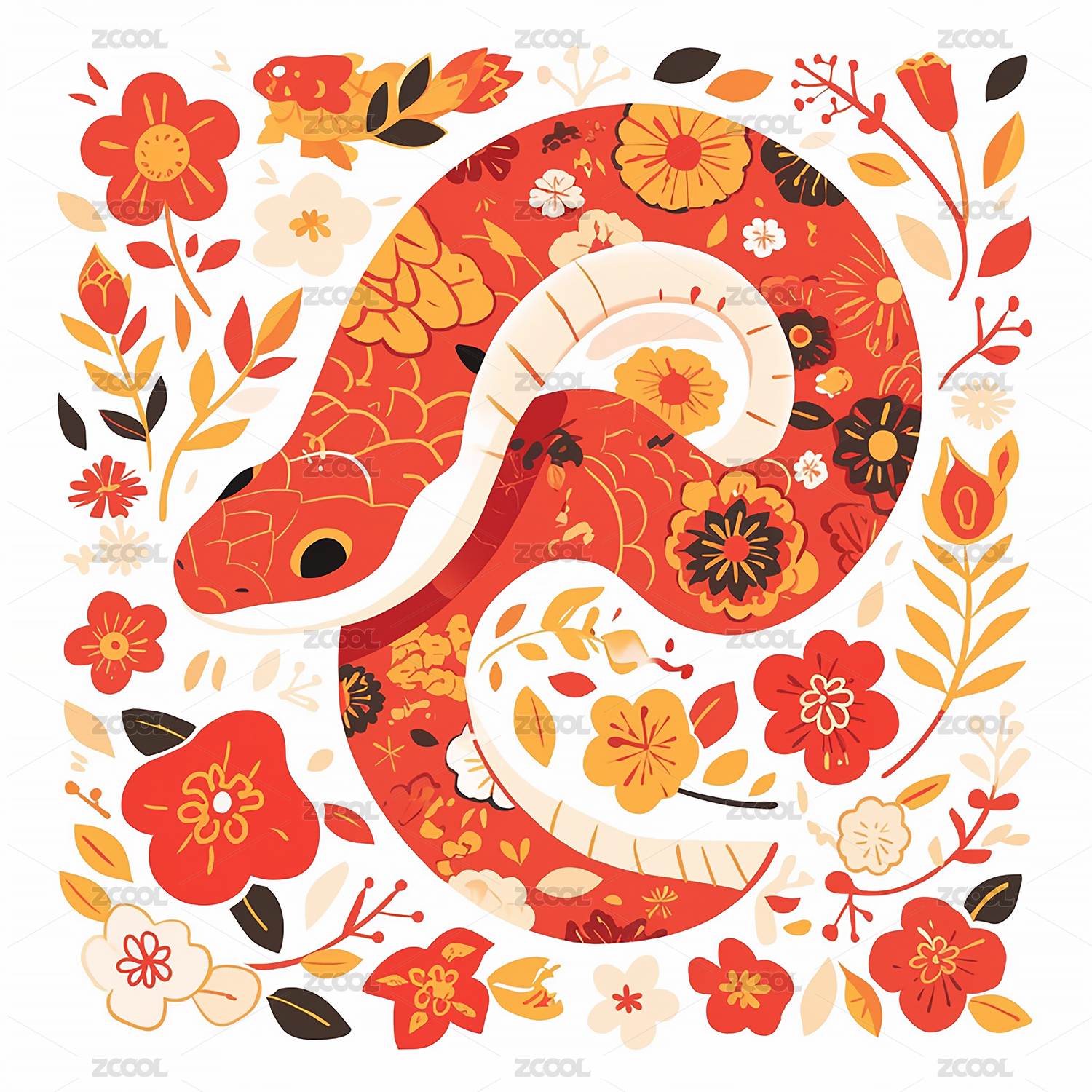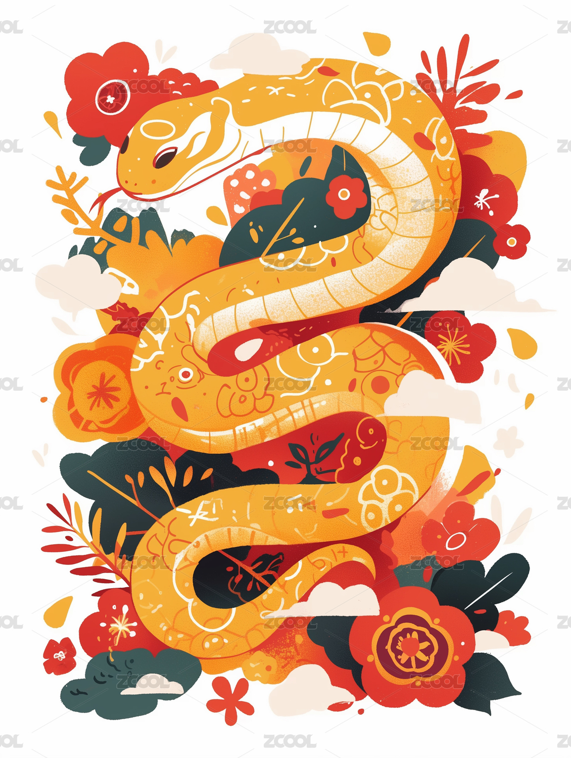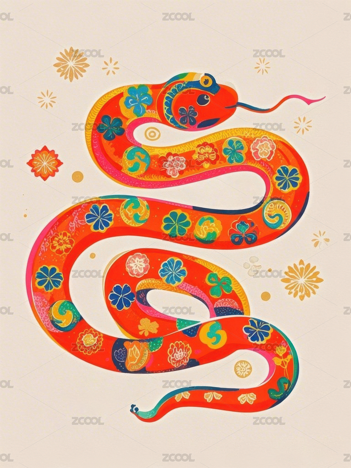 喜庆的复古风格五彩斑斓的蛇和花朵
