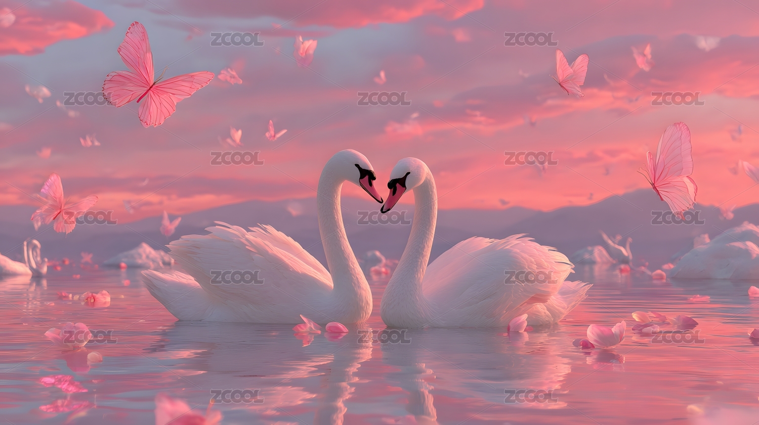 浪漫天鹅湖粉色夕阳爱意绵绵