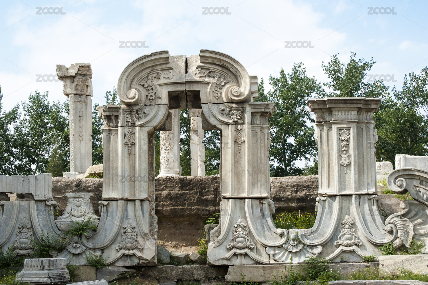 傍晚蓝色天空下中国北京圆明园大水法遗址