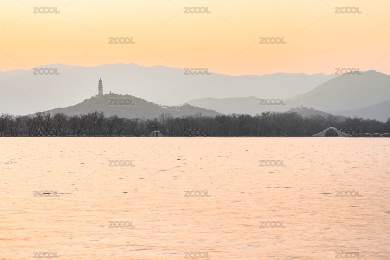 颐和园晚霞中的昆明湖和远处的玉泉塔美景
