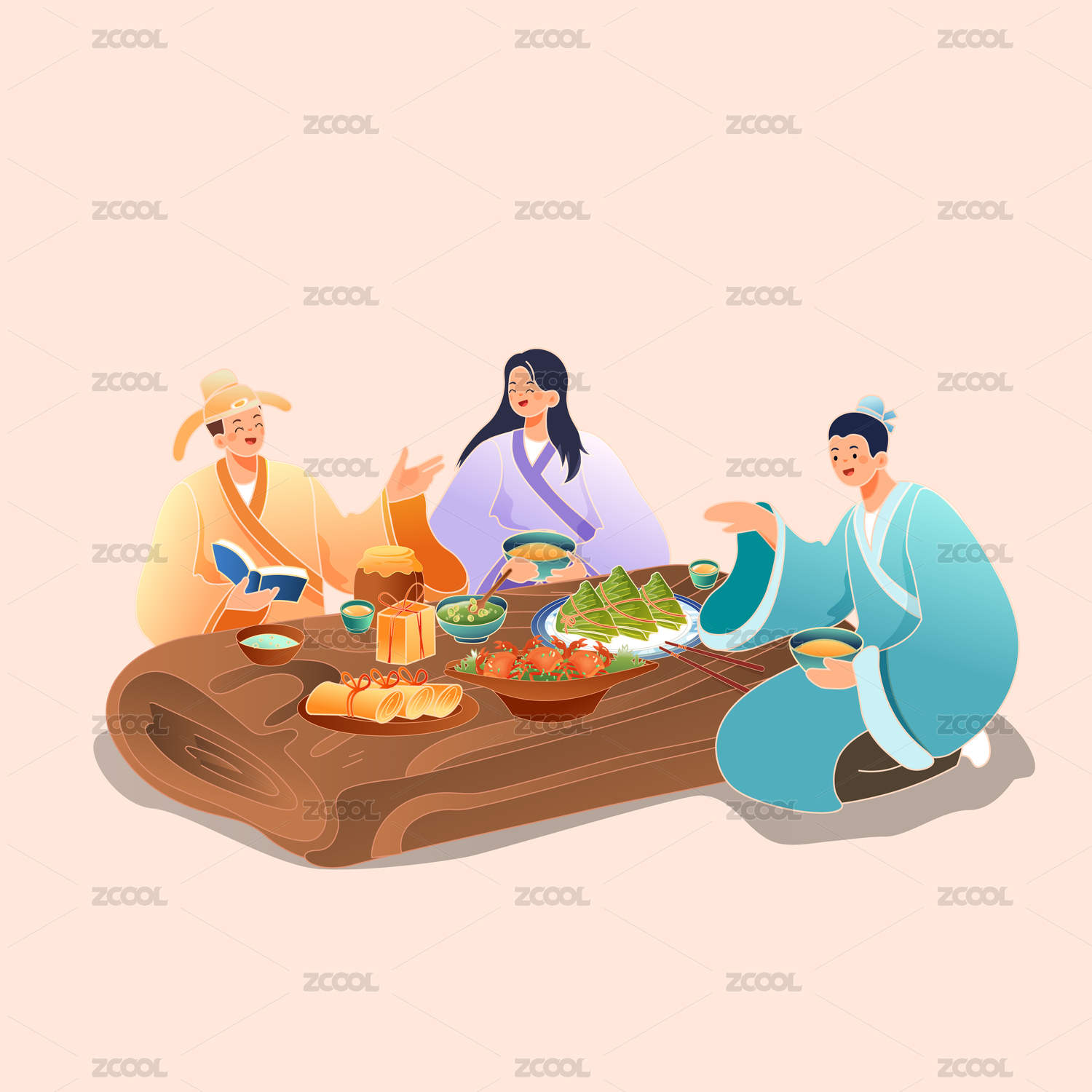 端午节古人吃饭矢量插画
