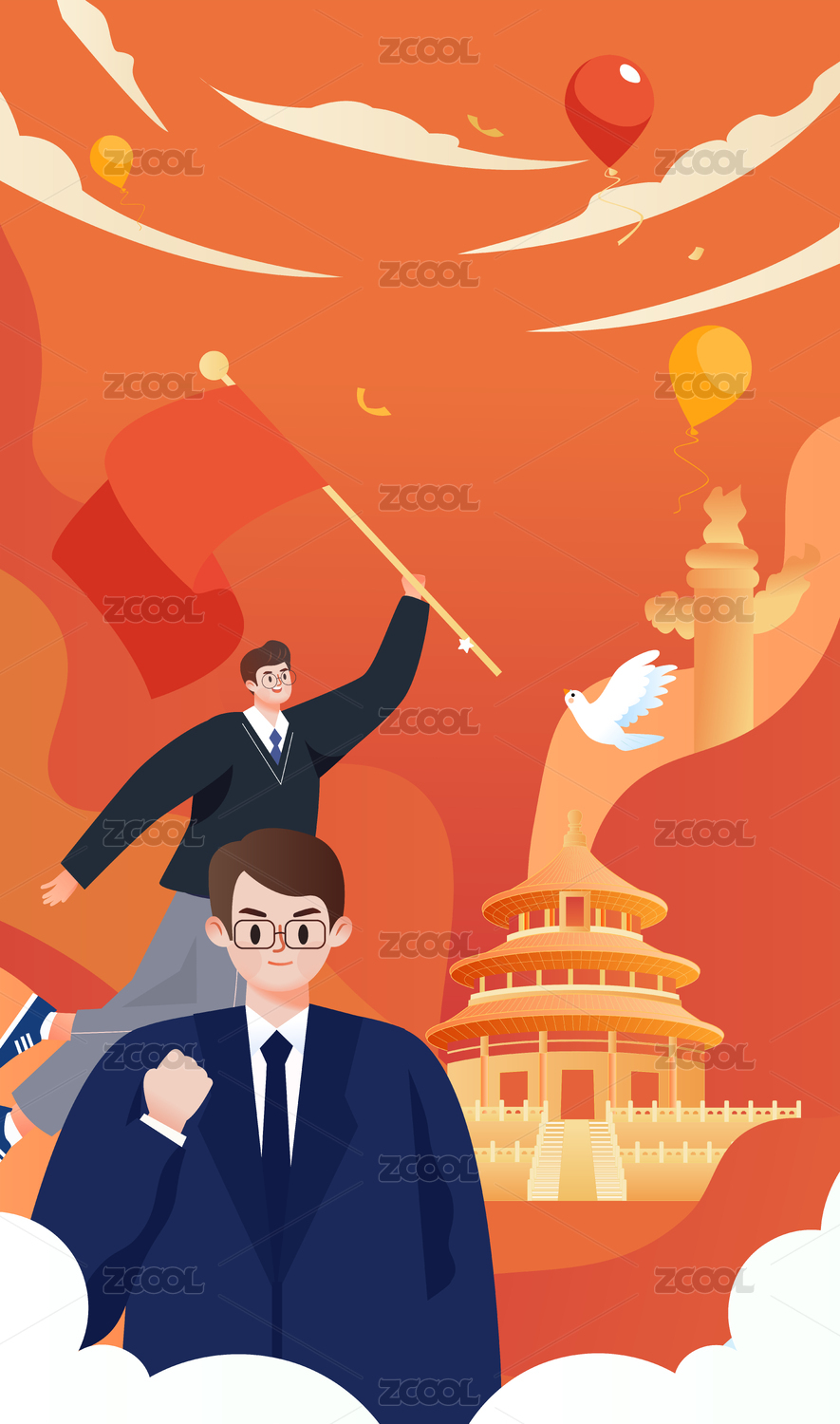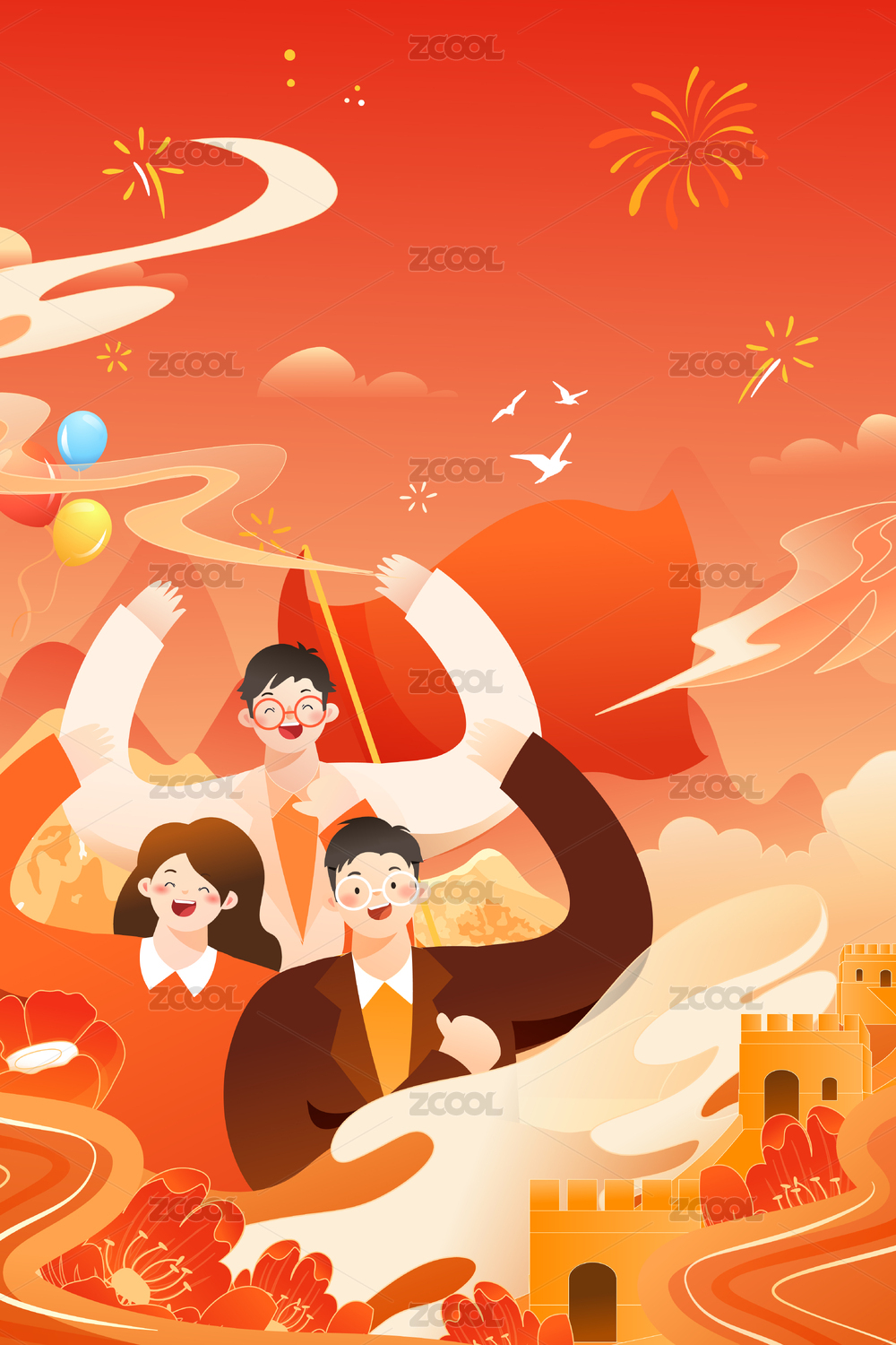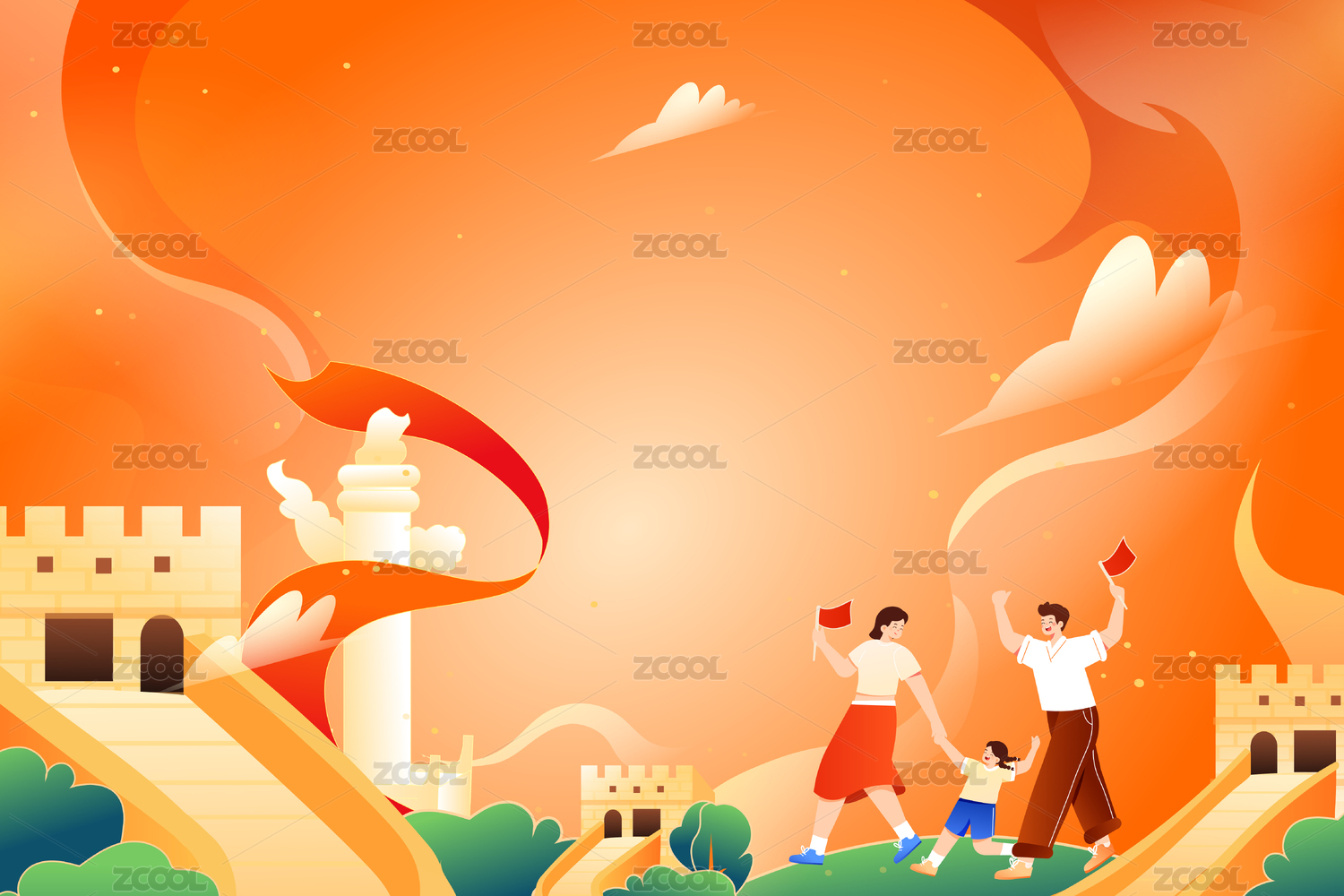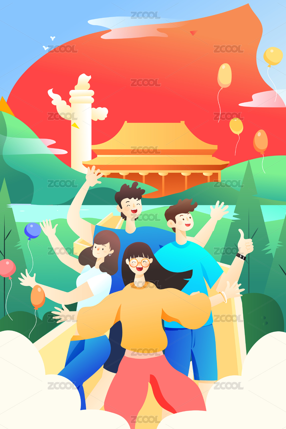 国庆节一家人出门景点旅游地标建筑国潮插画