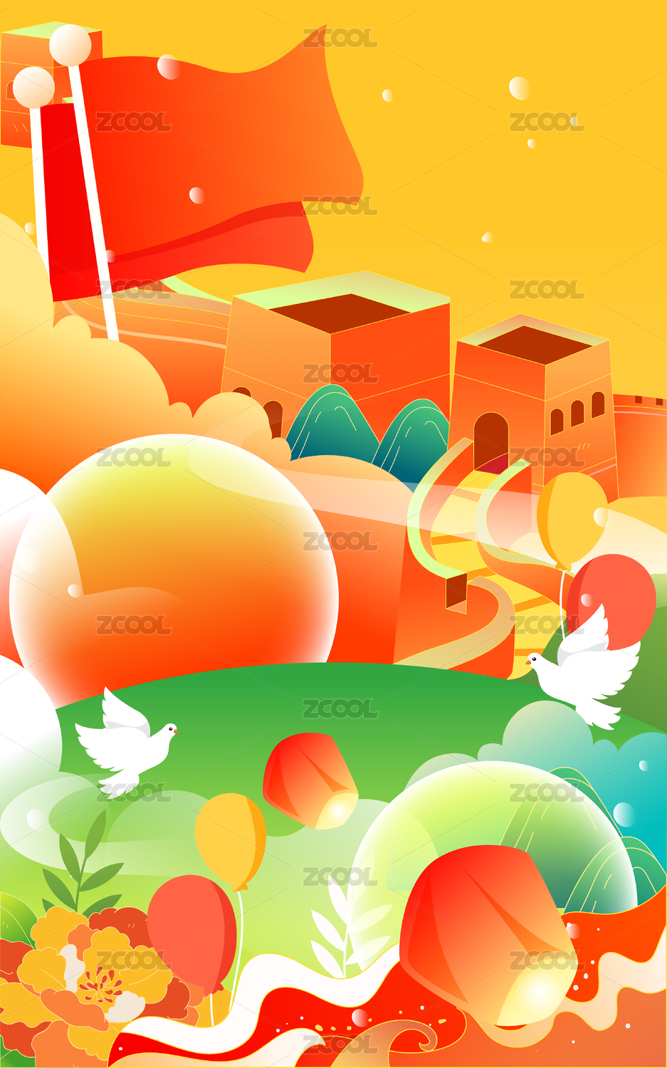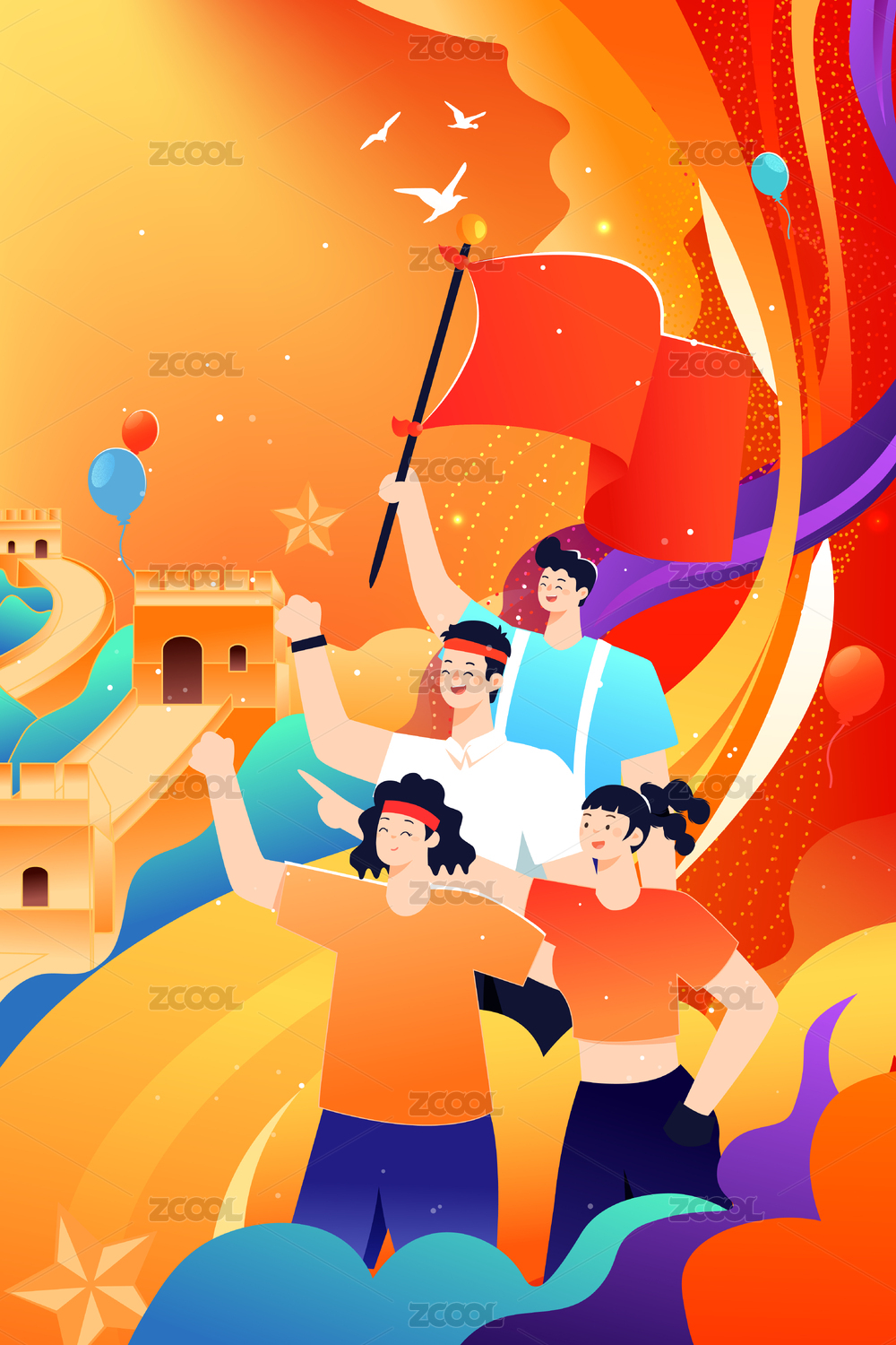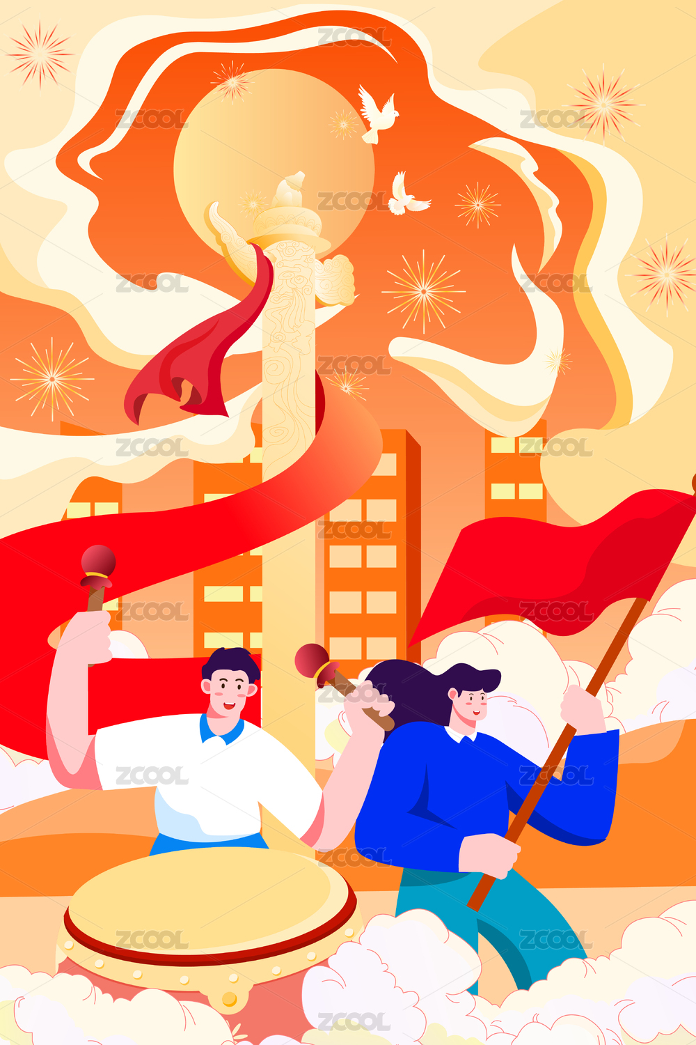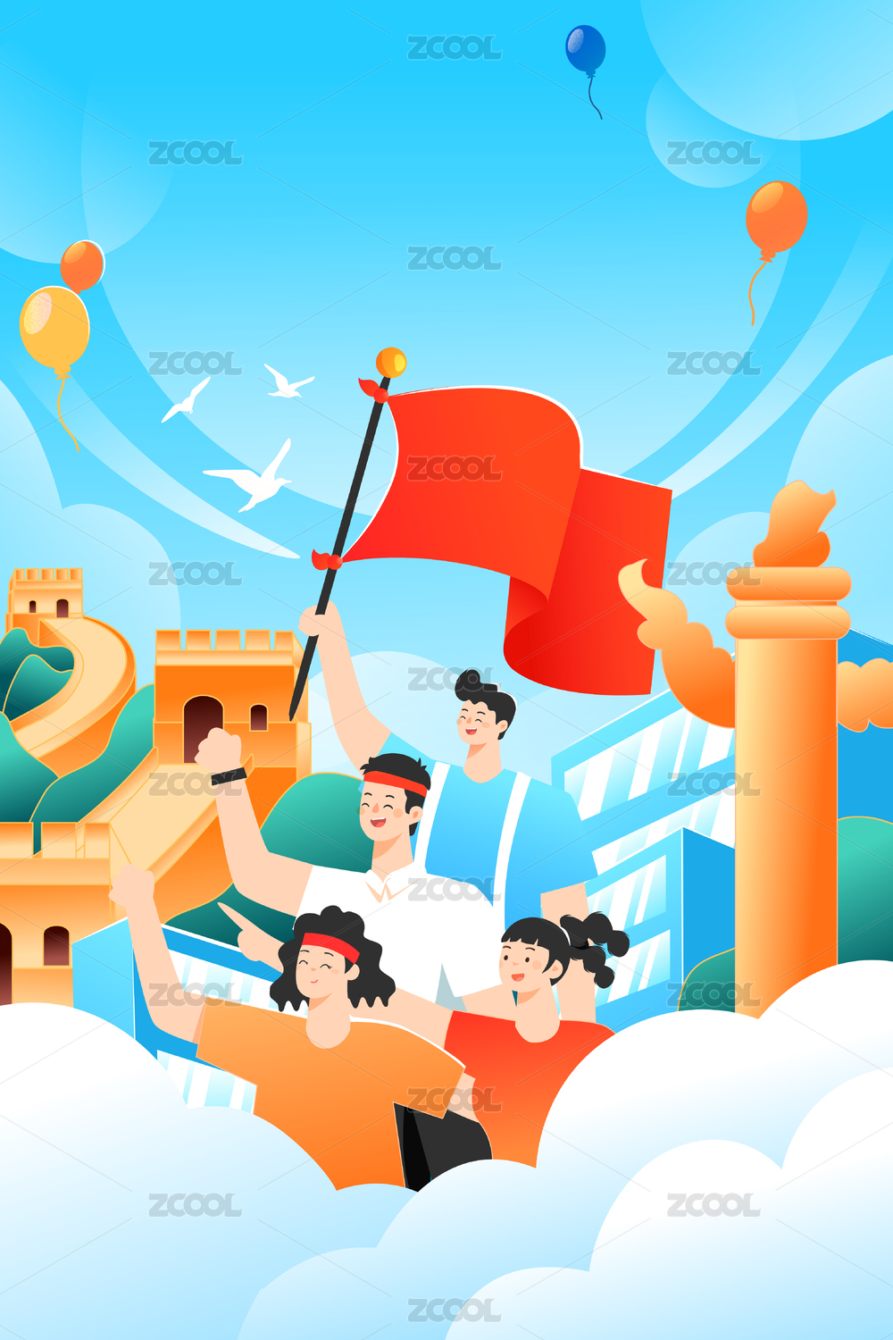 国庆节一家人出门景点旅游地标建筑国潮插画