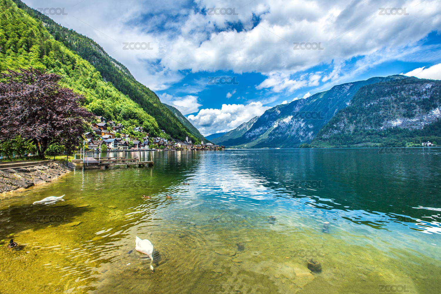 欧洲奥地利哈尔施塔特小镇湖畔风光