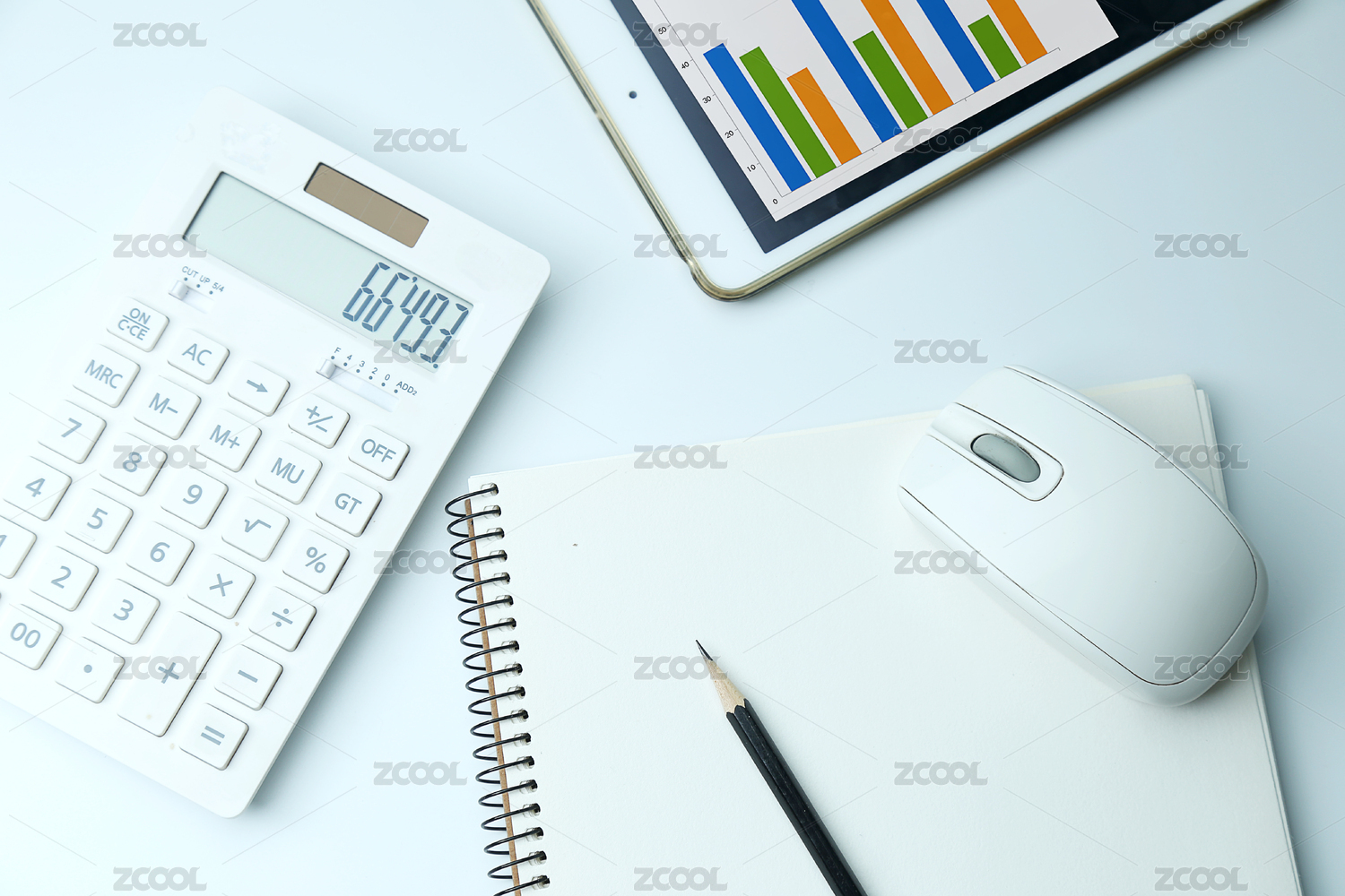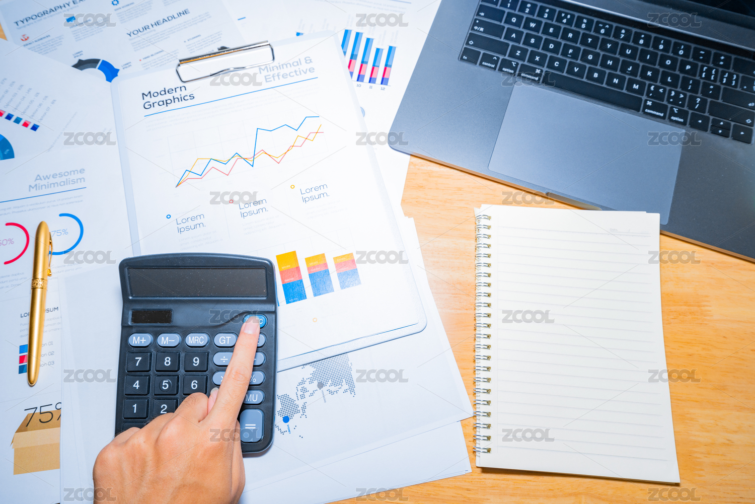 办公桌面上的计算器与金融报表,俯拍