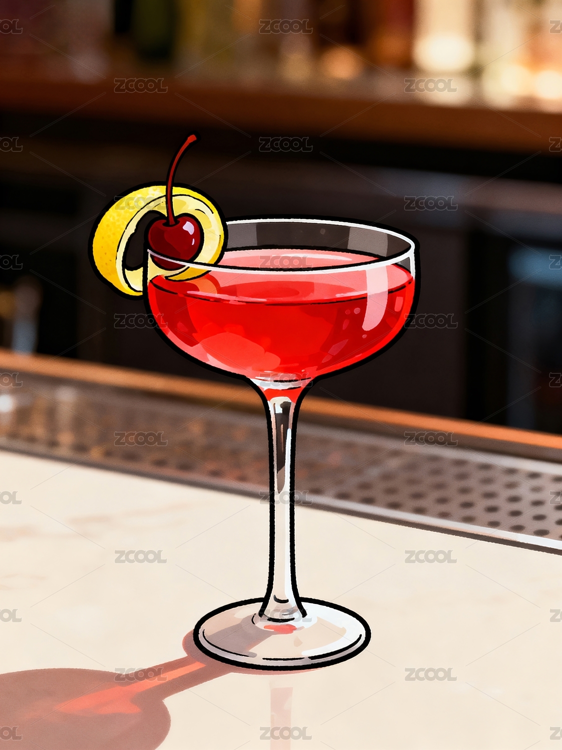 一杯鸡尾酒放在琳琅满目的酒柜前的吧台上