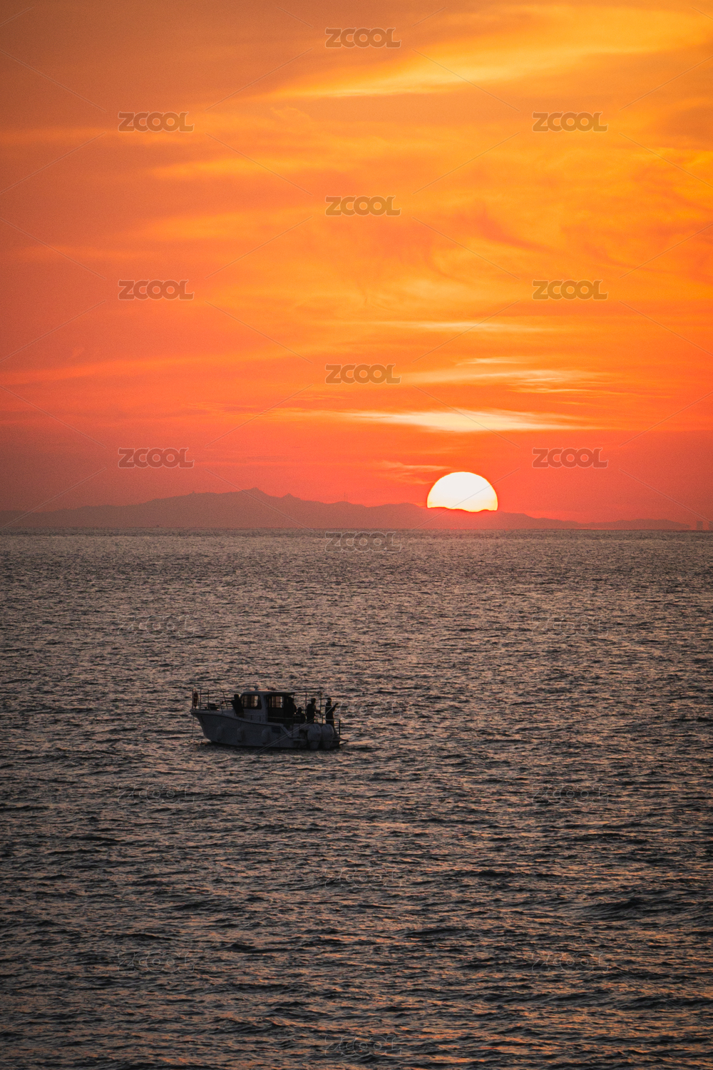 中国广西涠洲岛橘子海日落与夕阳下的渔船