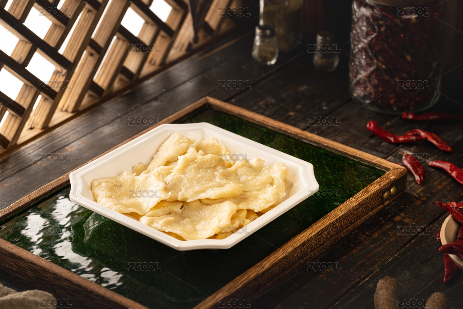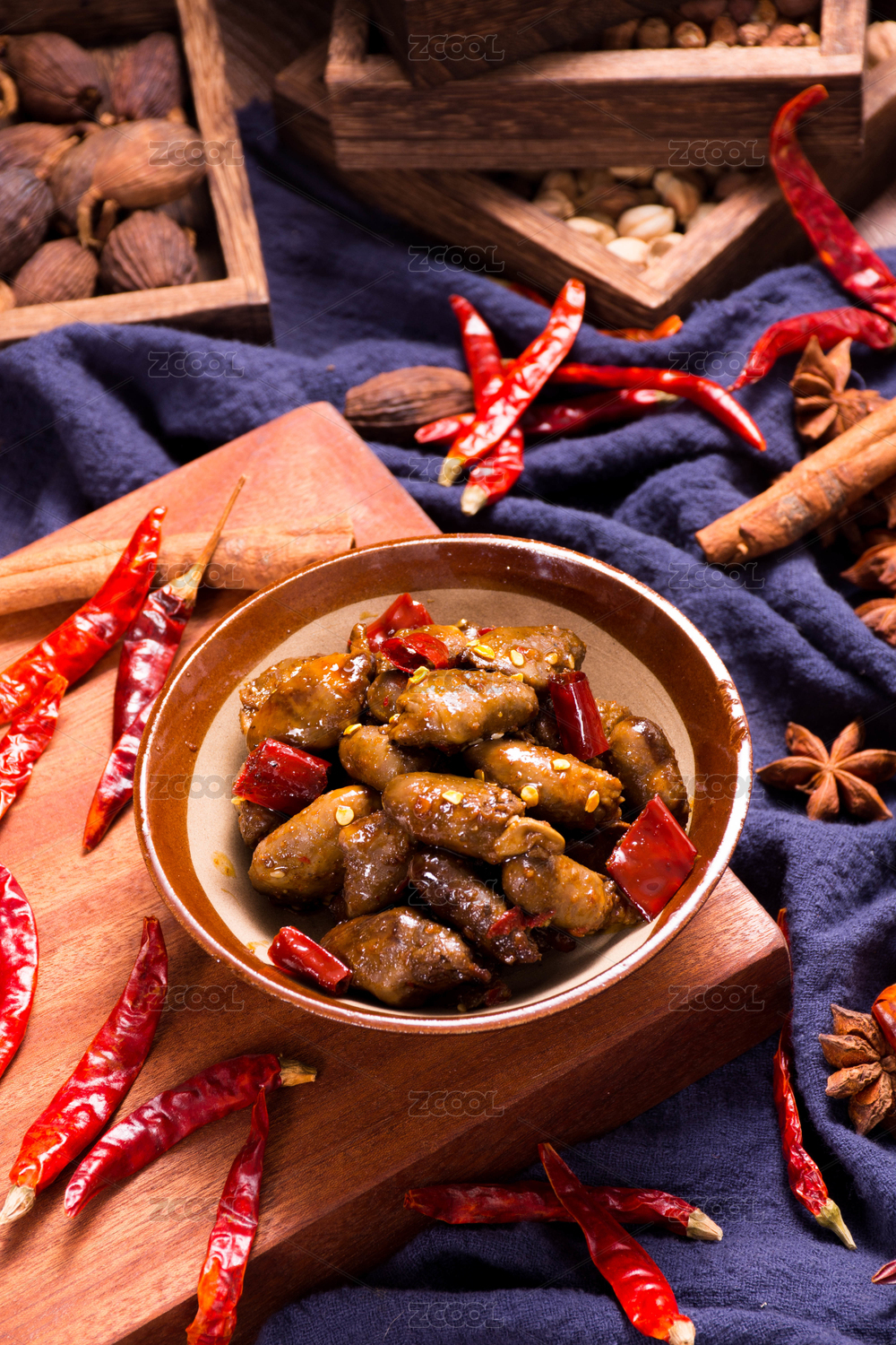 木桌上陶碗里的重庆麻辣特产怪味胡豆瓣