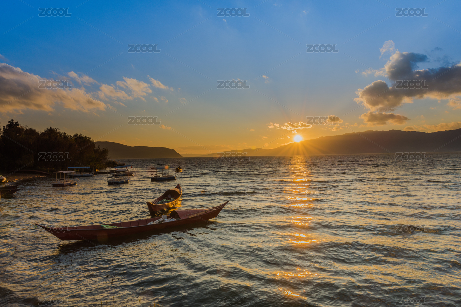 云南昆明澄江抚仙湖清晨的朝霞霞光与船