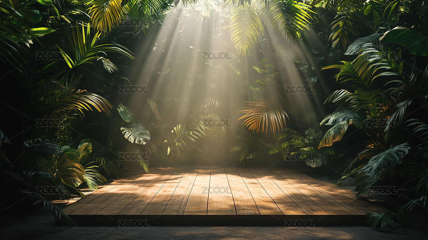 丛林阳光下的木质展示台