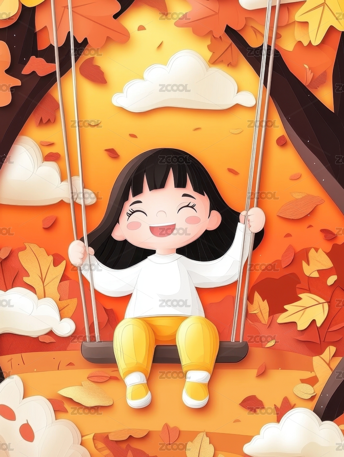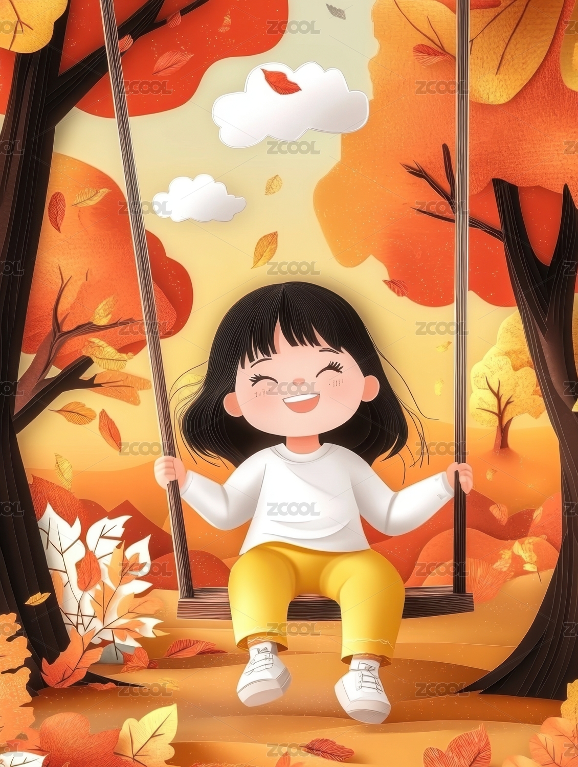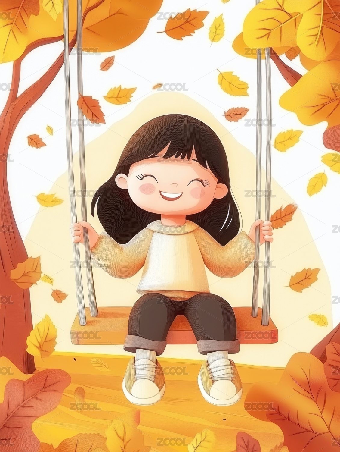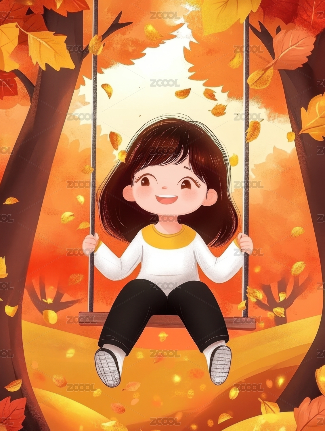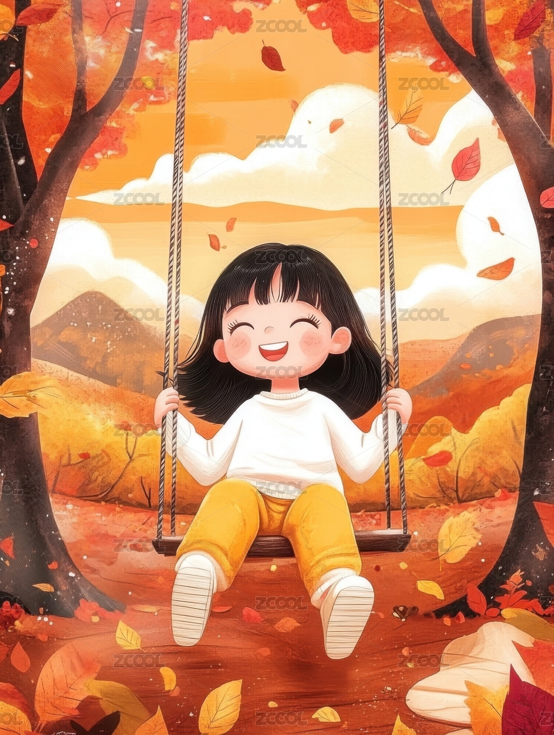 秋天自然户外小女孩卡通漫画插画