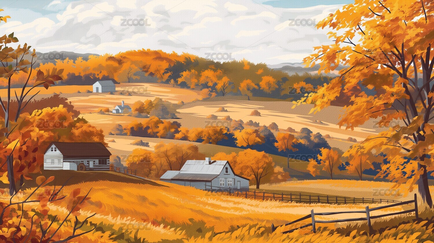 秋天美丽静谧的田园风光插画