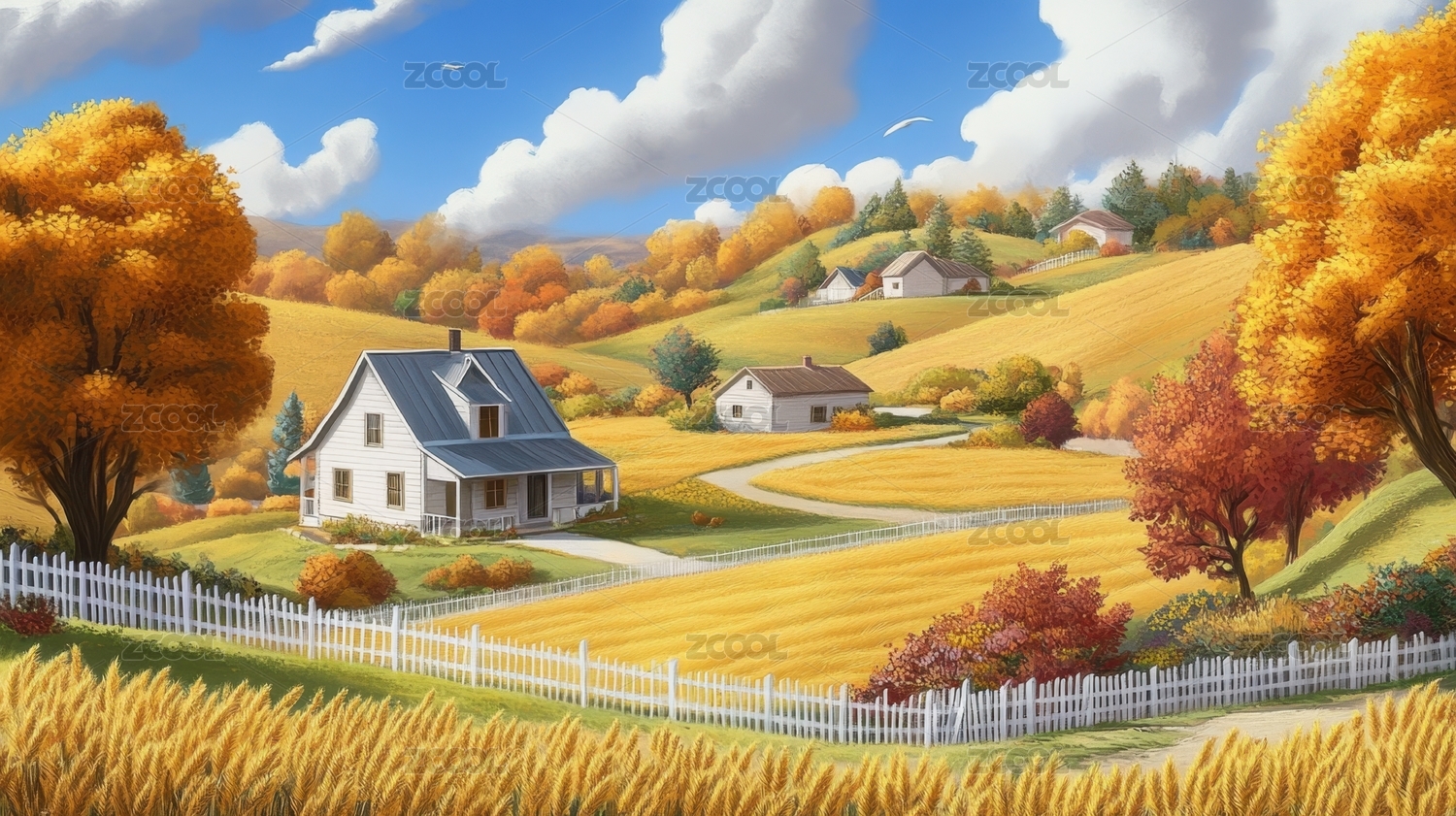 秋日乡间小路白房子