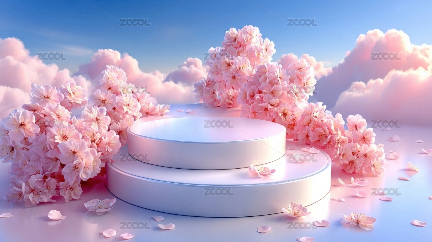 圆形,展台,展架,台阶,楼梯,电商,粉色,云雾,植物,清新