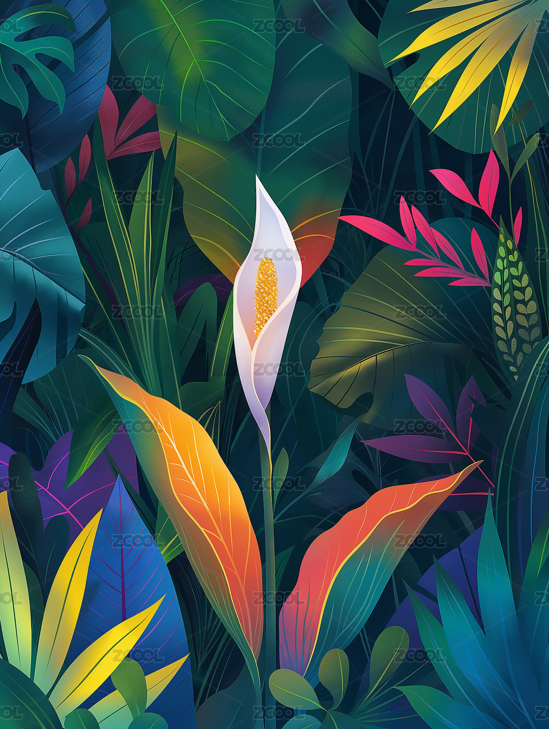白色马蹄莲百合花热带雨林中盛开简约扁平风