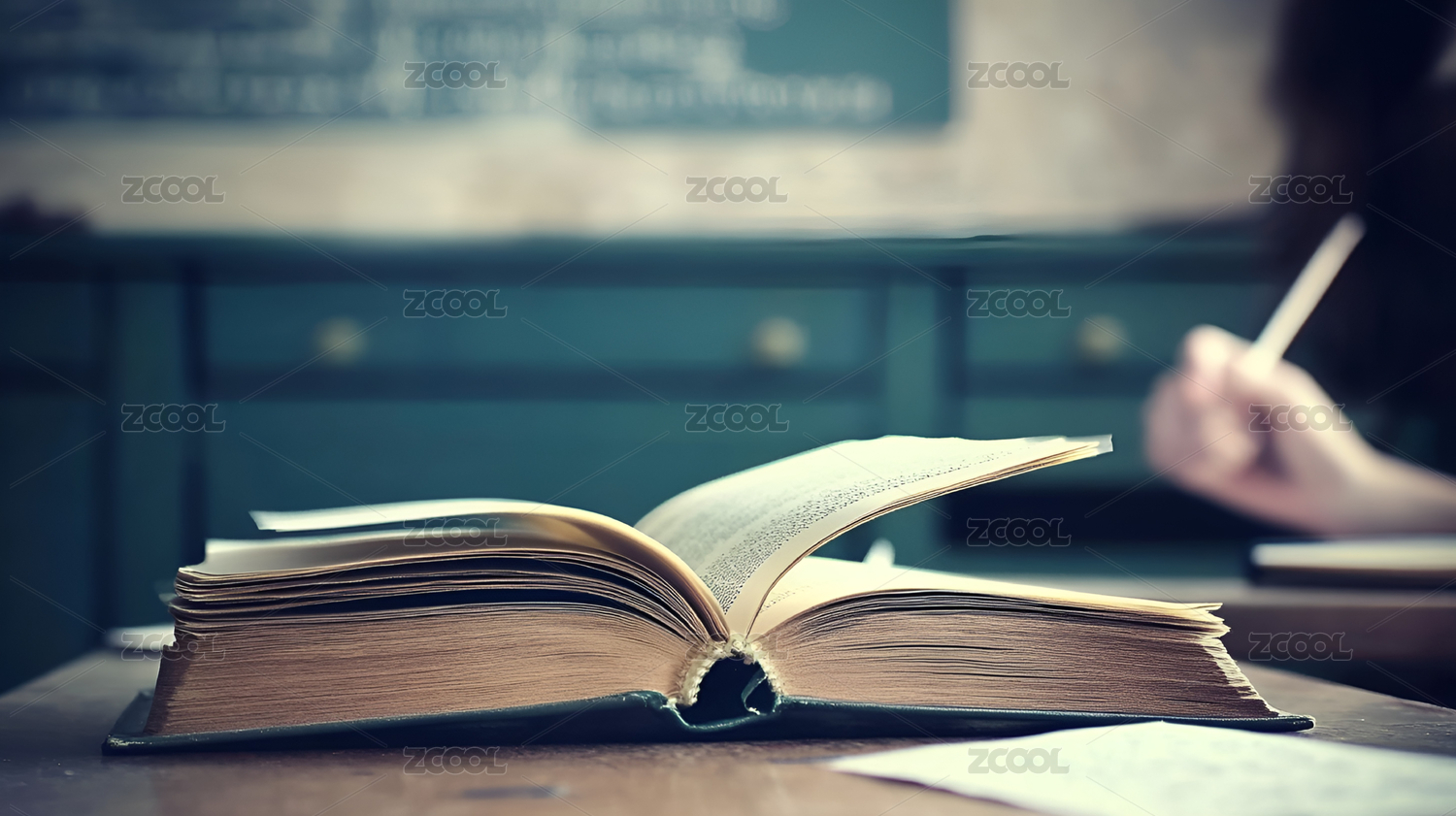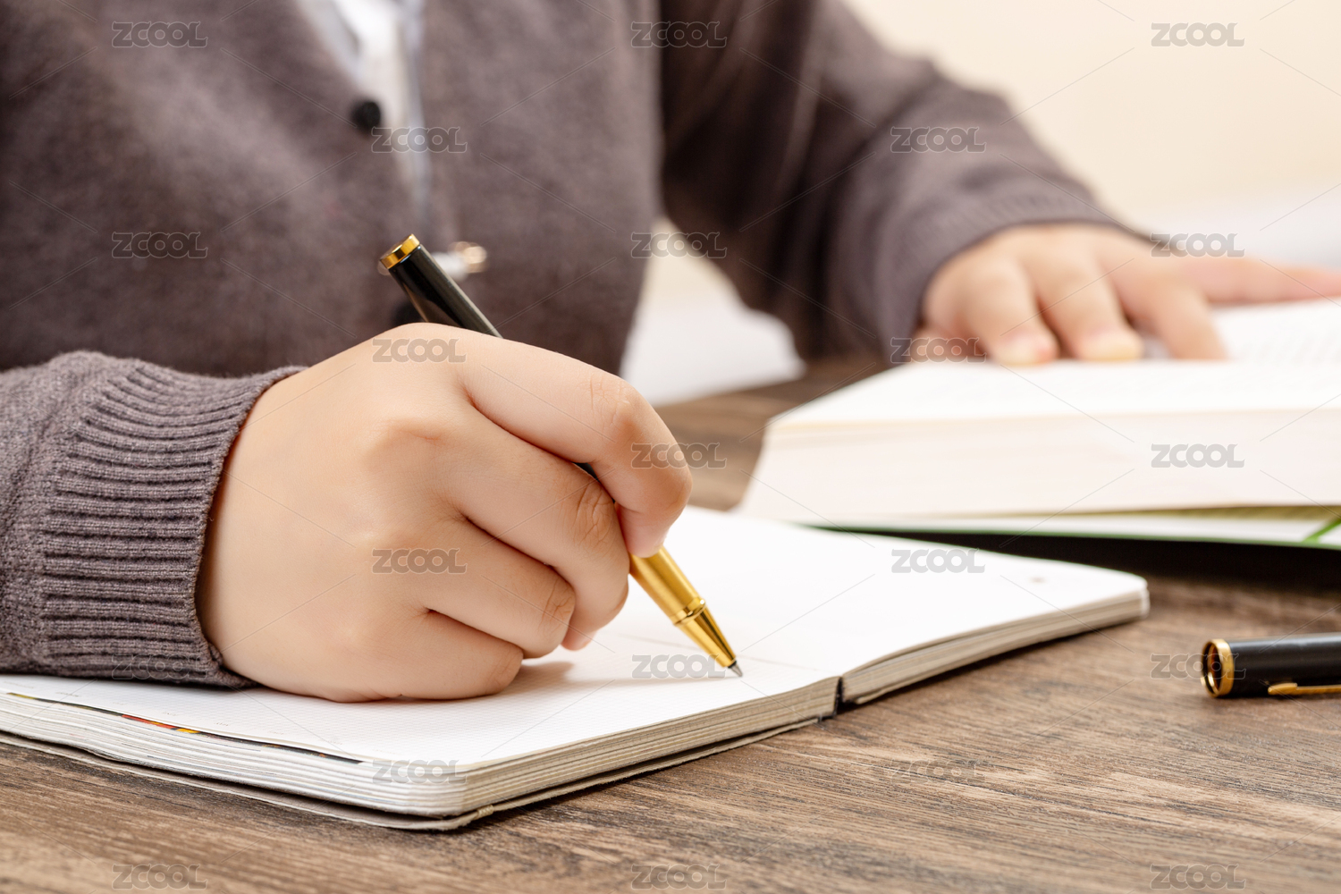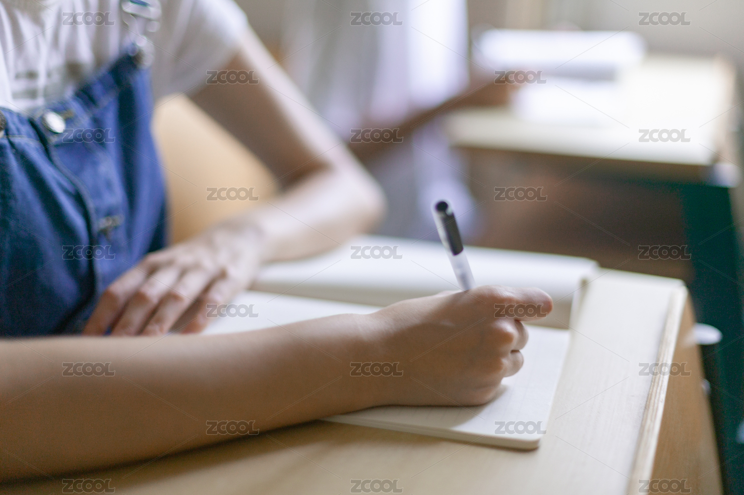 一个中国女学生在教室内笔记本上书写着内容,记录着笔记
