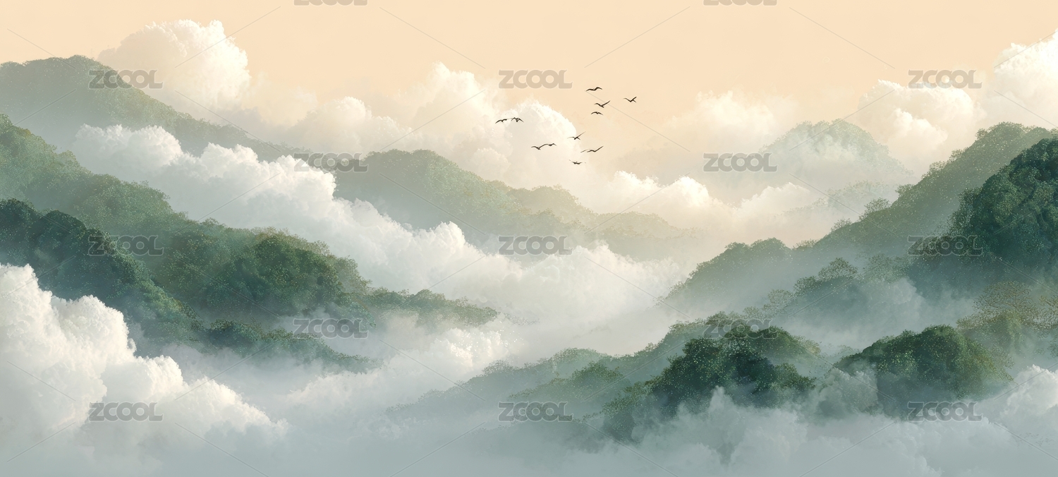 云雾中的雪山与飞鸟