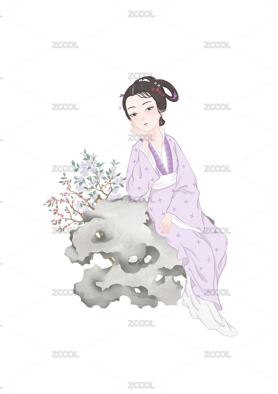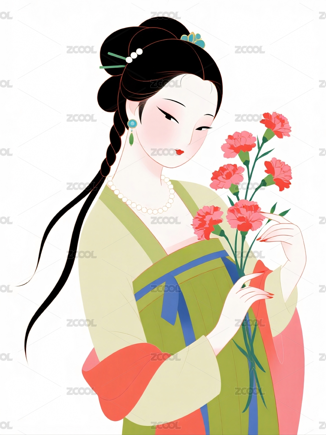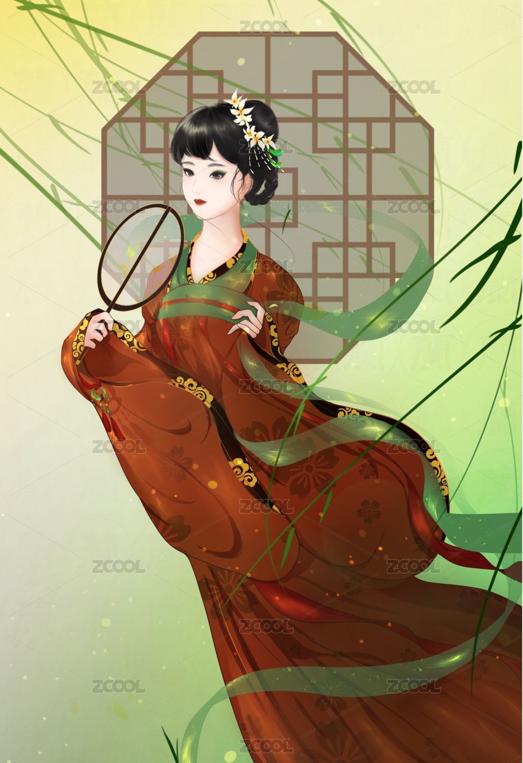 簪花仕女图之拿着扇子的芭蕉兰花少女