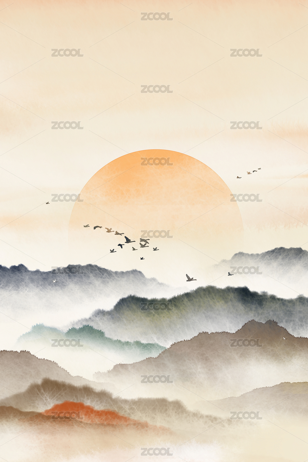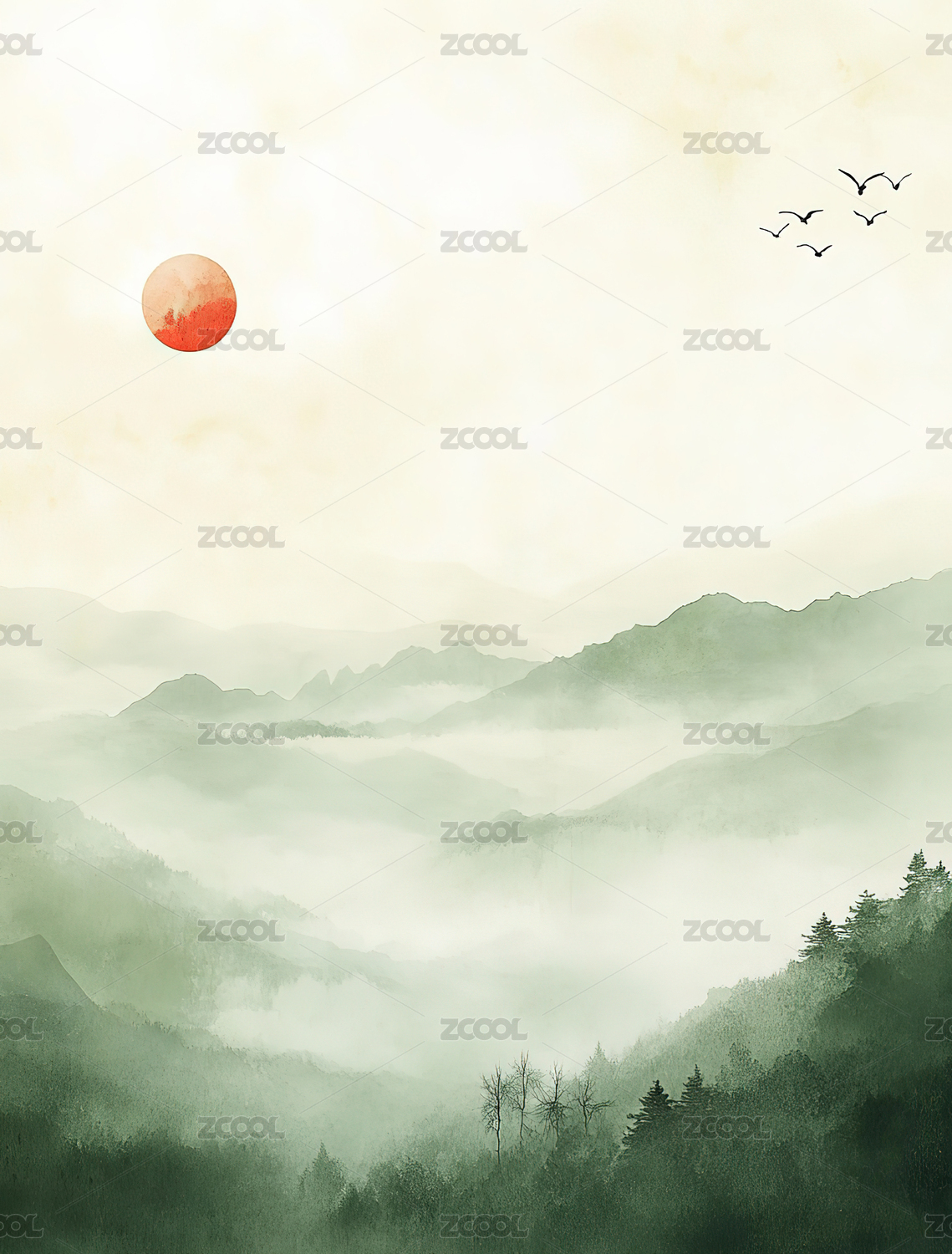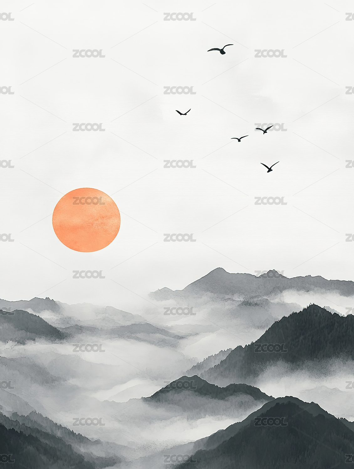黄昏的云海复古水墨山水画