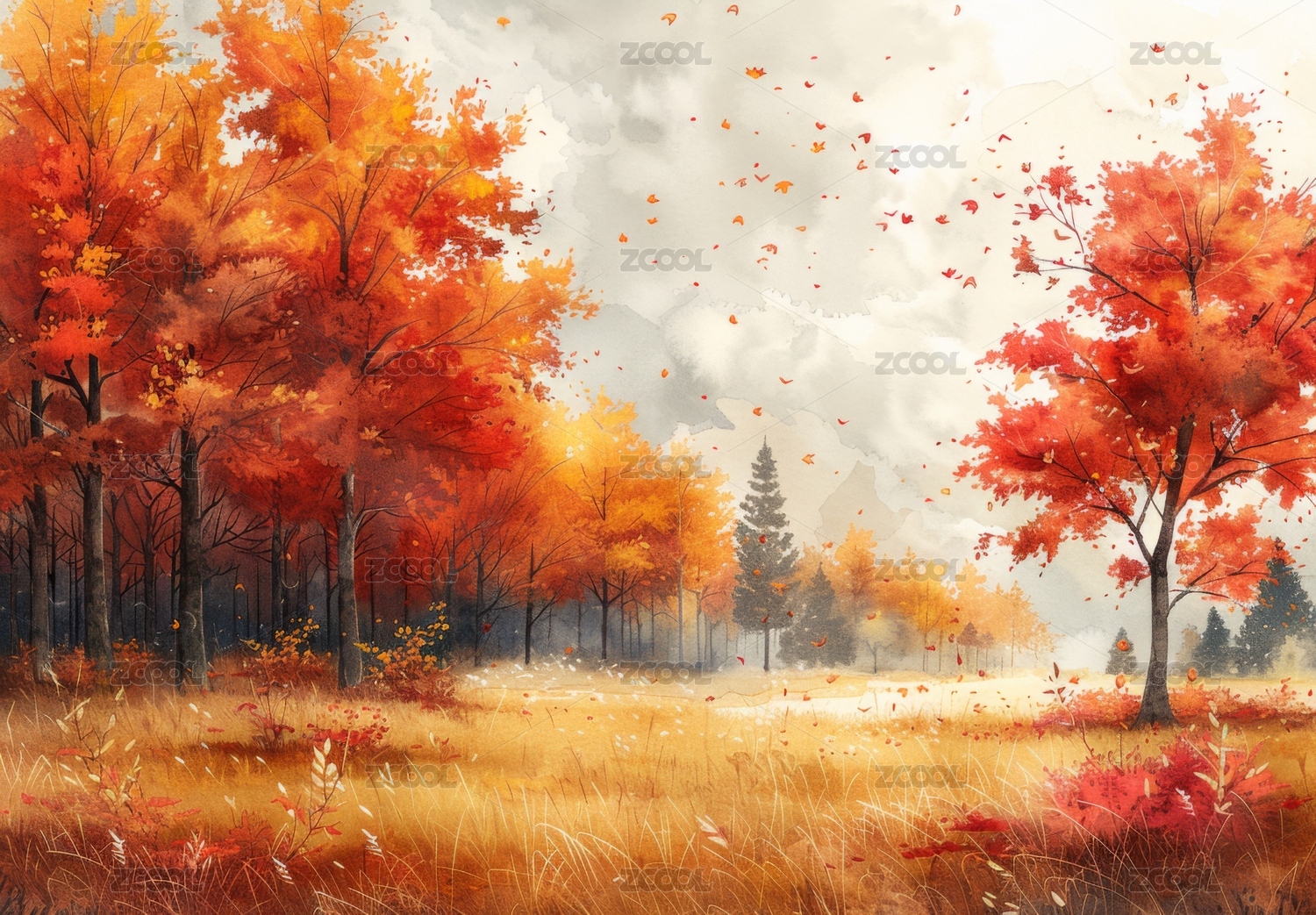秋季风景插画水彩风格