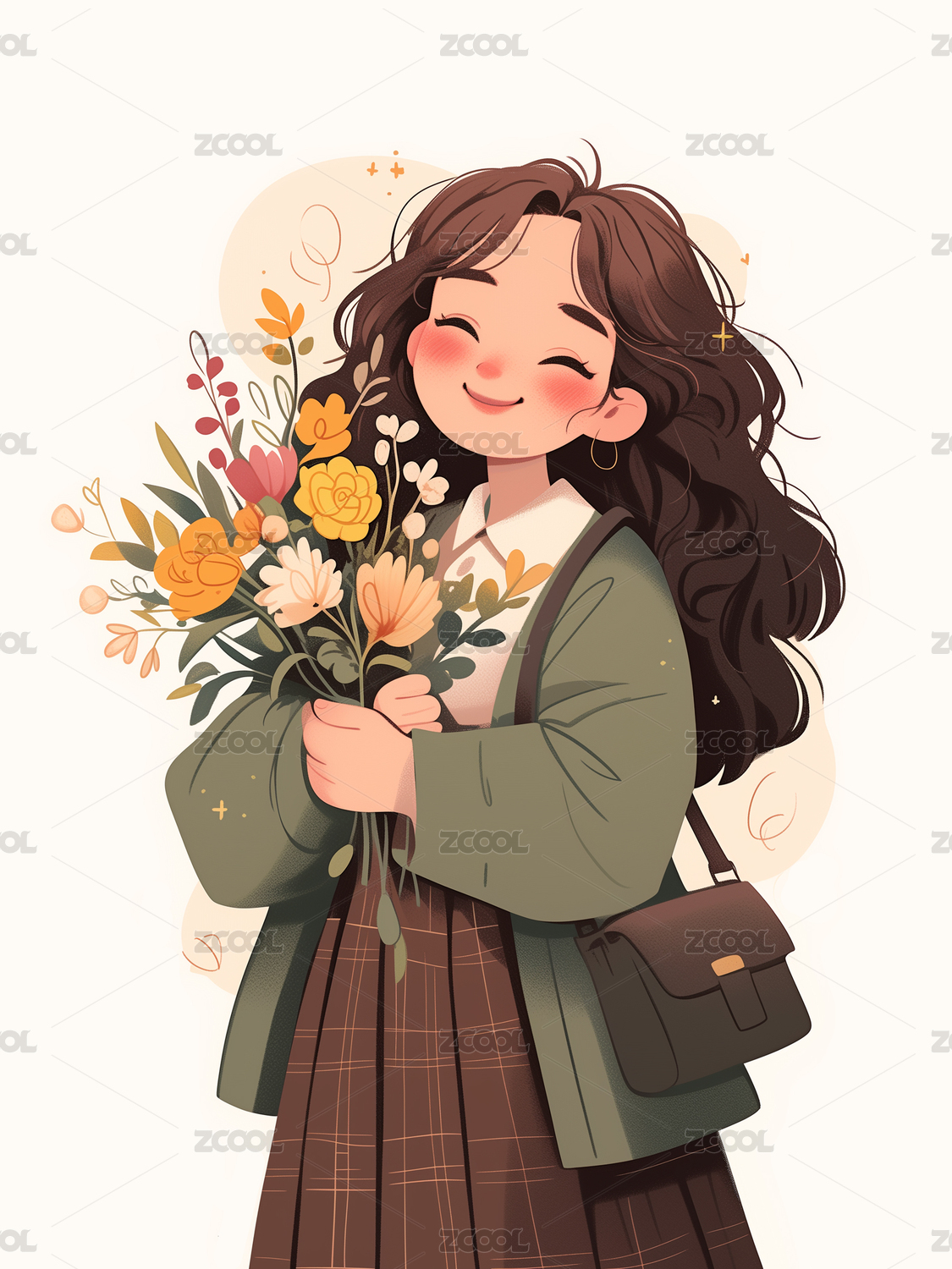 女生手捧鲜花插画,感恩节教师节母亲节概念