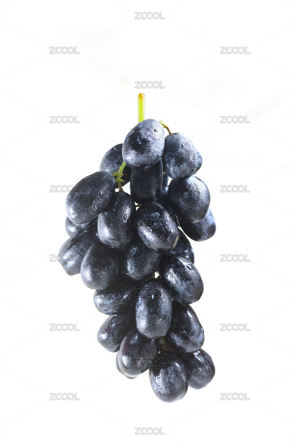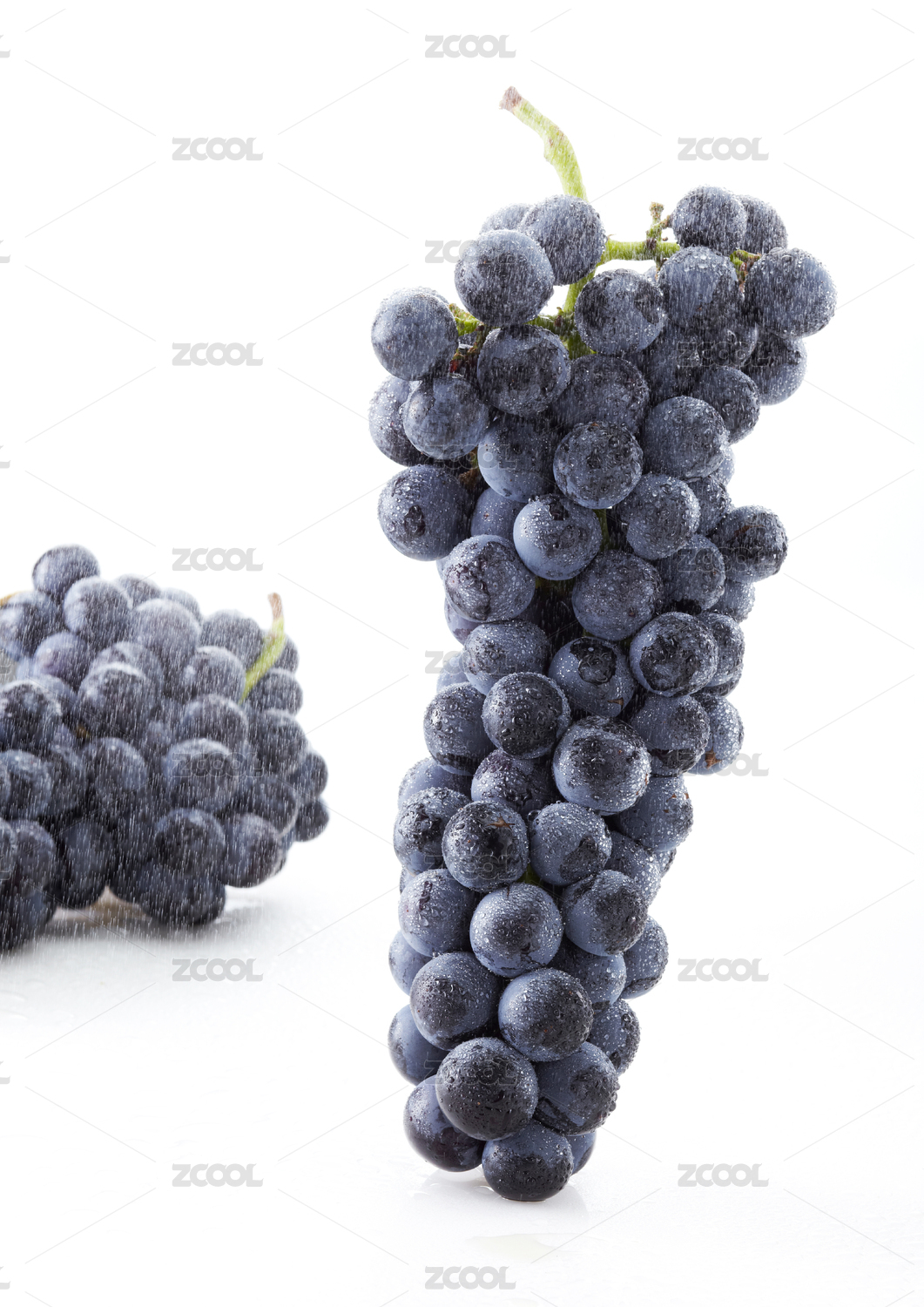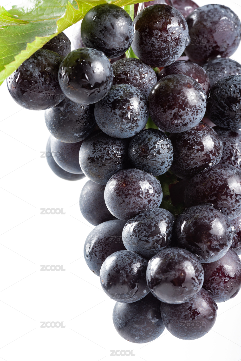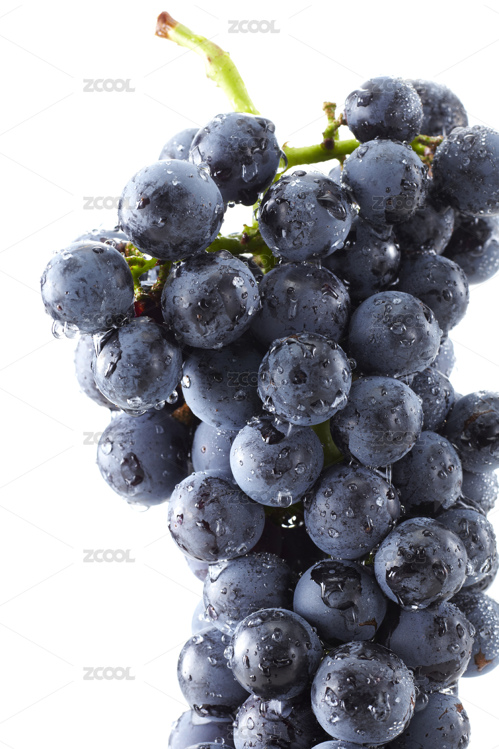 喷着水雾的新鲜深紫色葡萄,在白色背景里