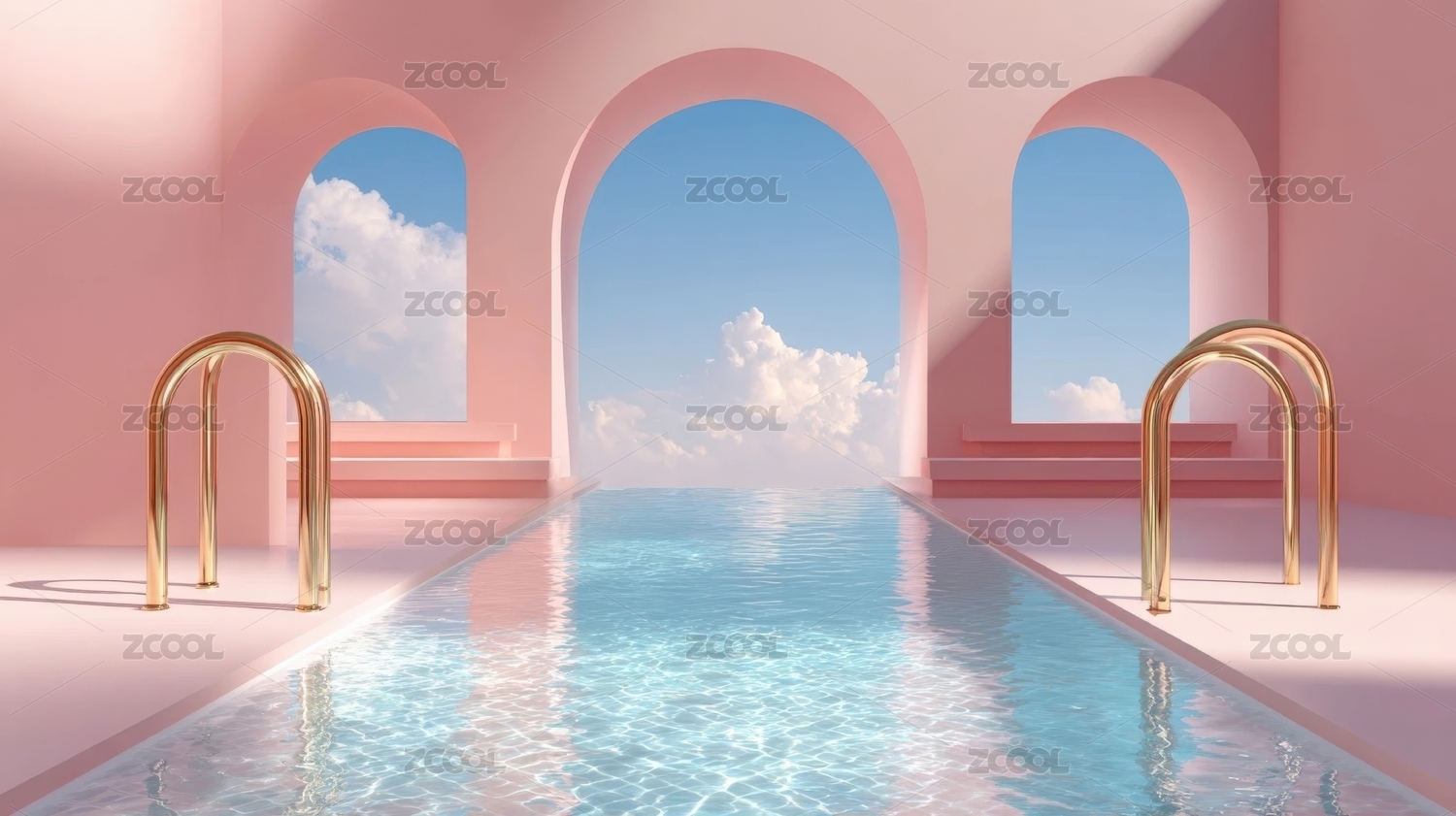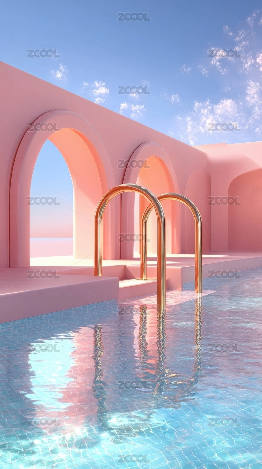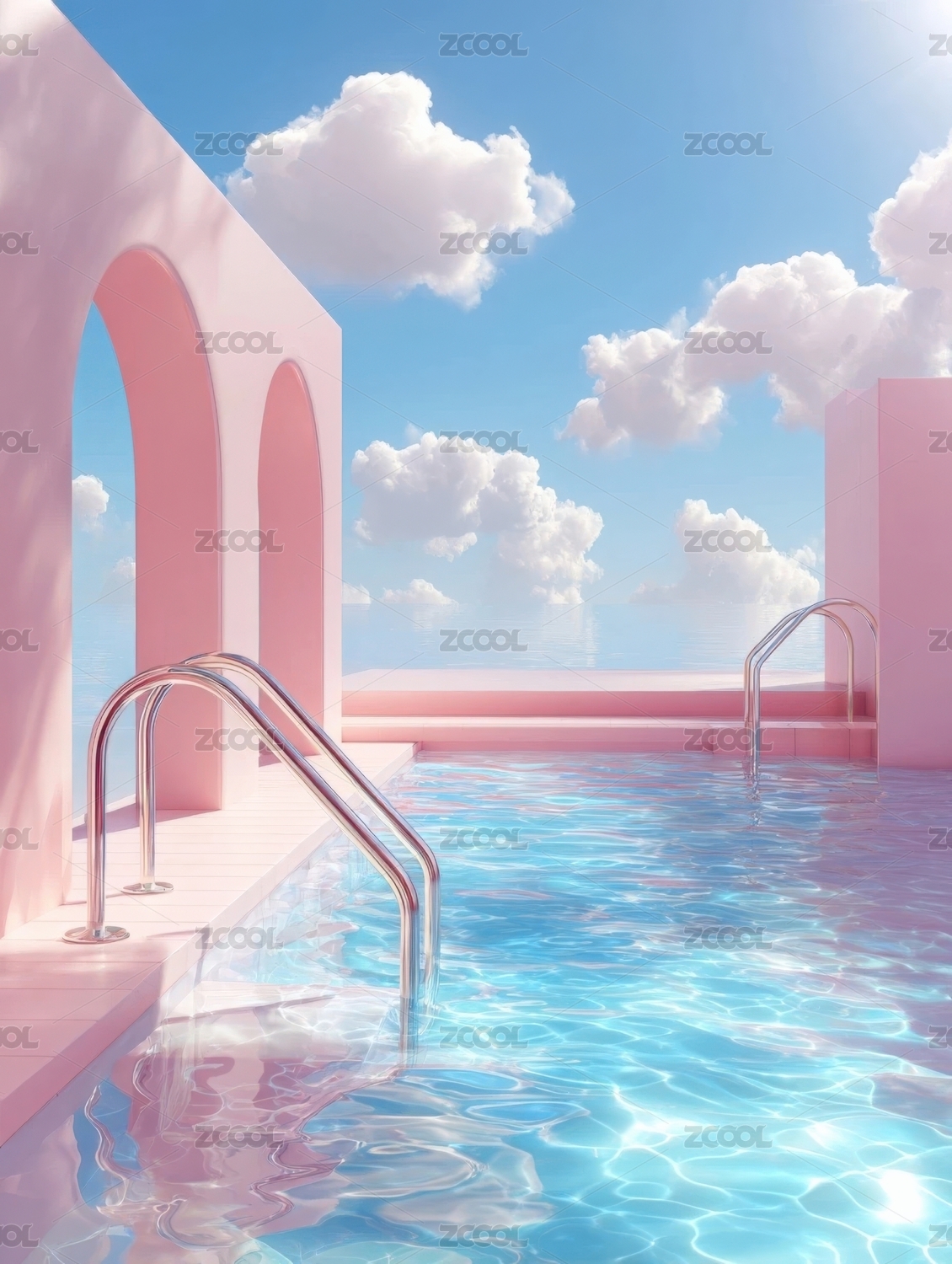 游泳池,彩虹,扶手,夏天,蓝天,白云,清澈,水面,阳光