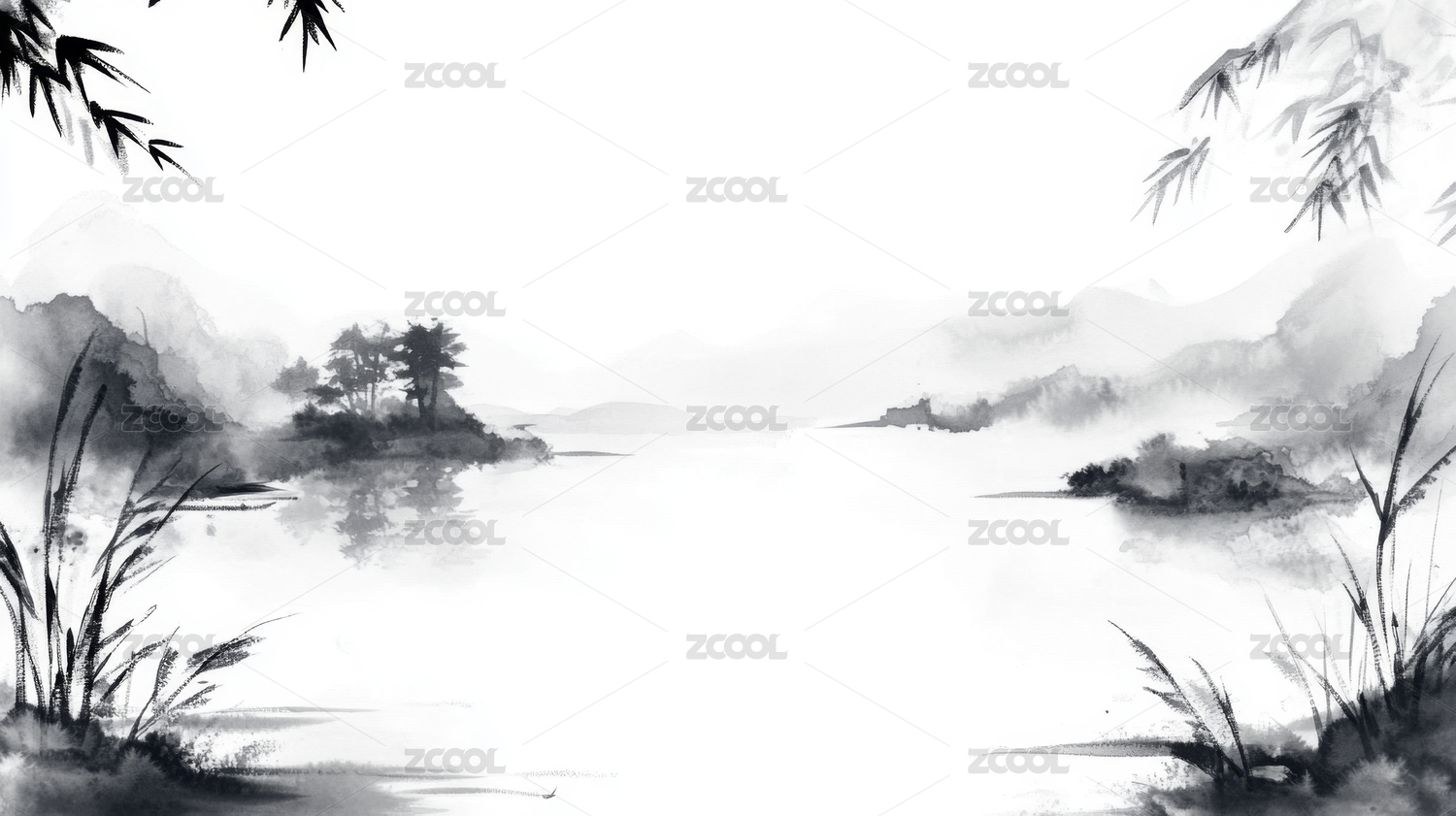 水墨画,湖畔,树木,飞鸟,自然,艺术,宁静,黑白,传统
