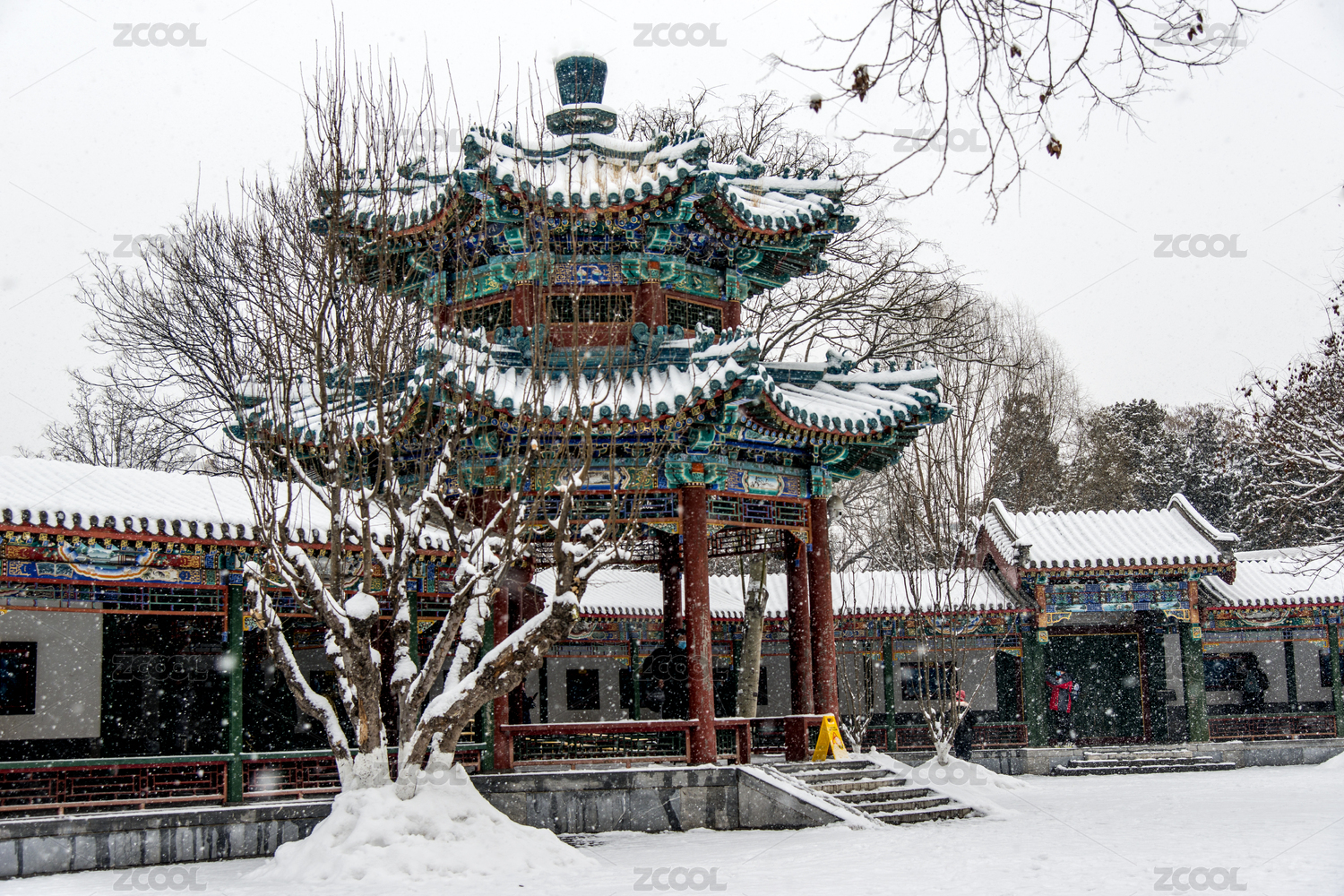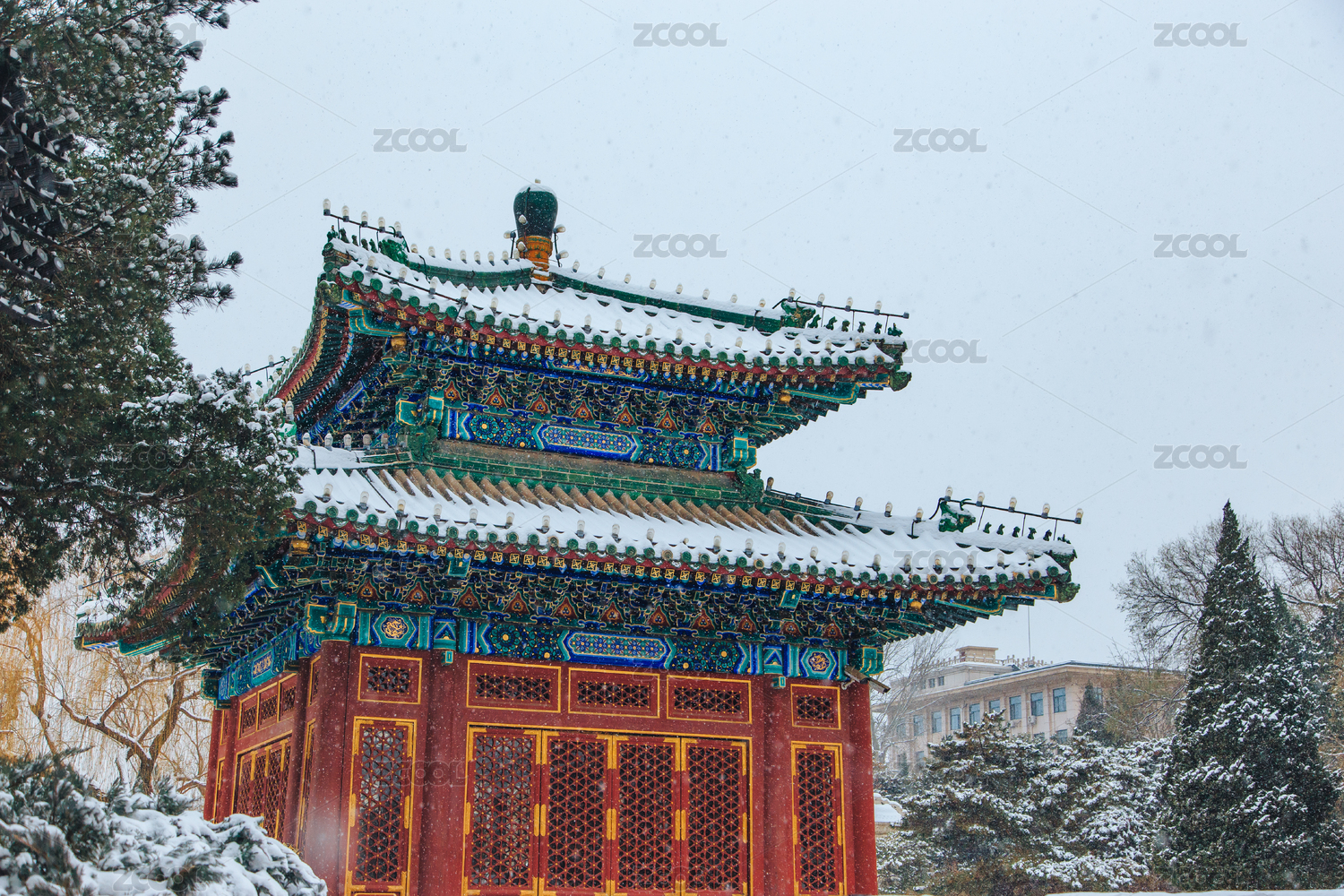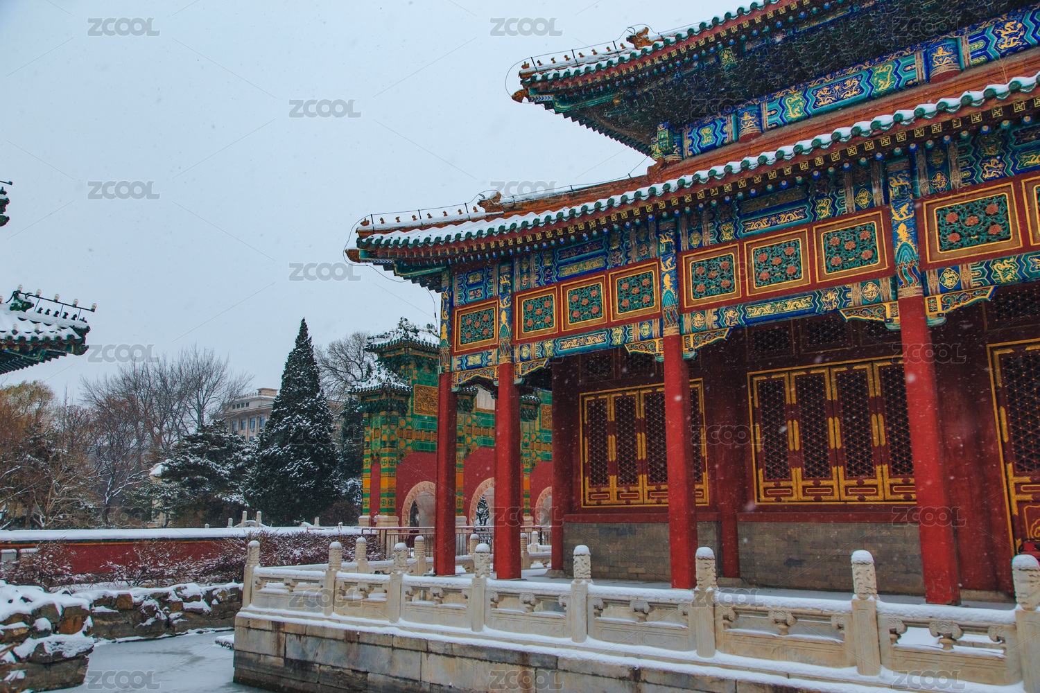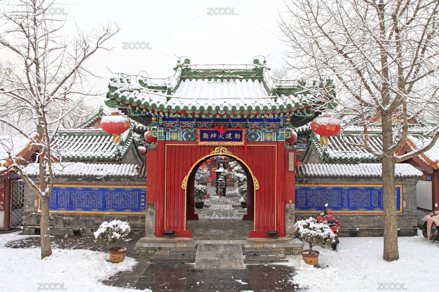 中国北京什刹海地区的火神庙(火德真君庙)冬日雪景