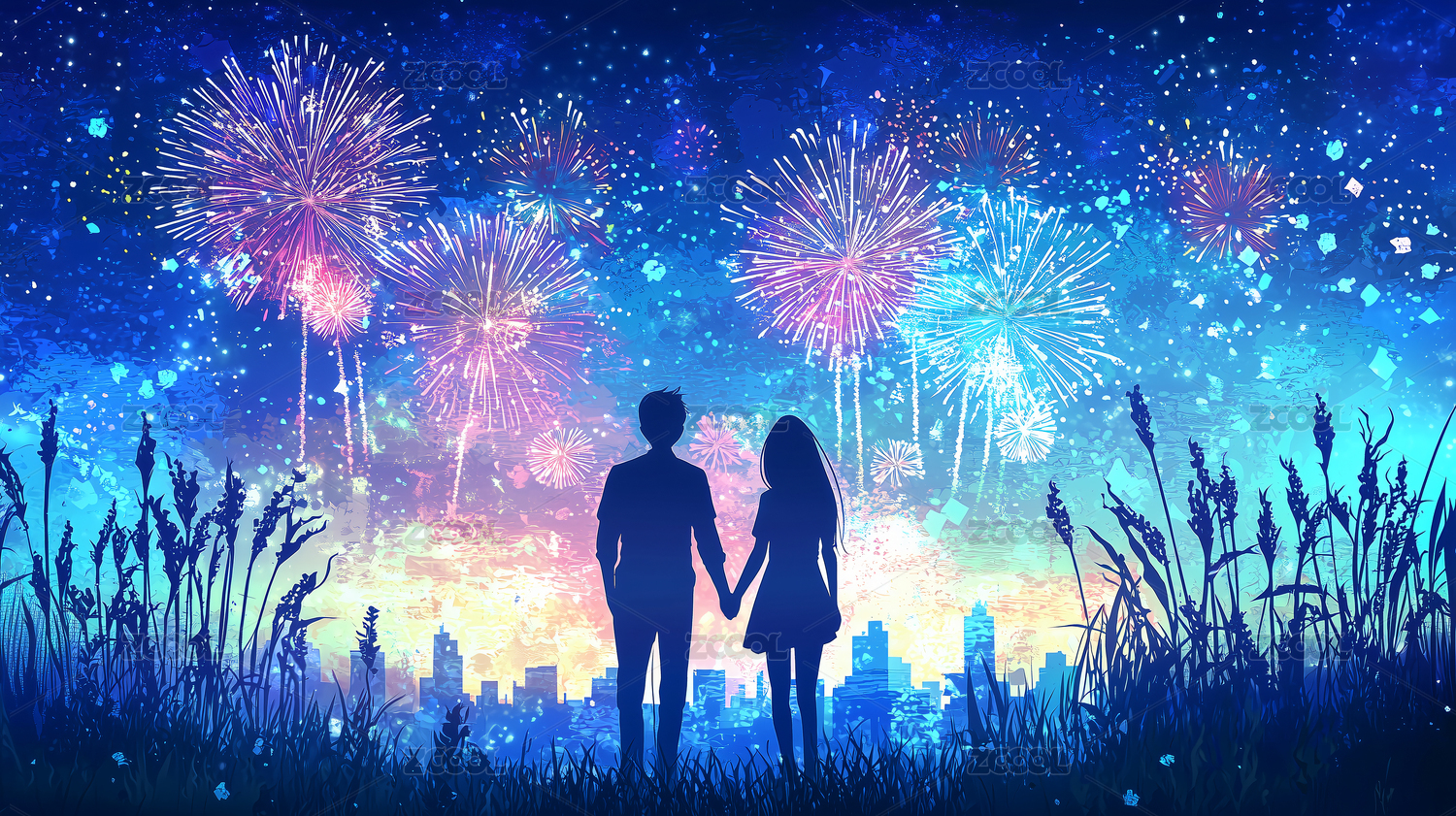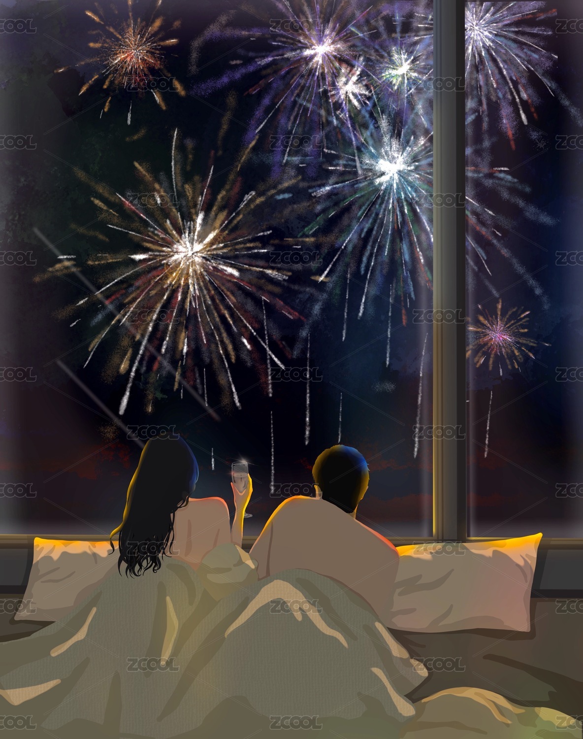 蓝色背景天空放烟花在桥上拥抱的情侣
