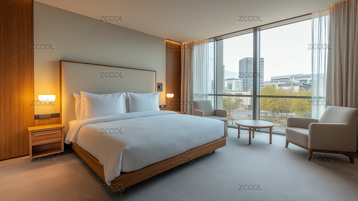 现代,豪华,大窗,床,枕头,地毯,椅子,窗帘,设计,舒适