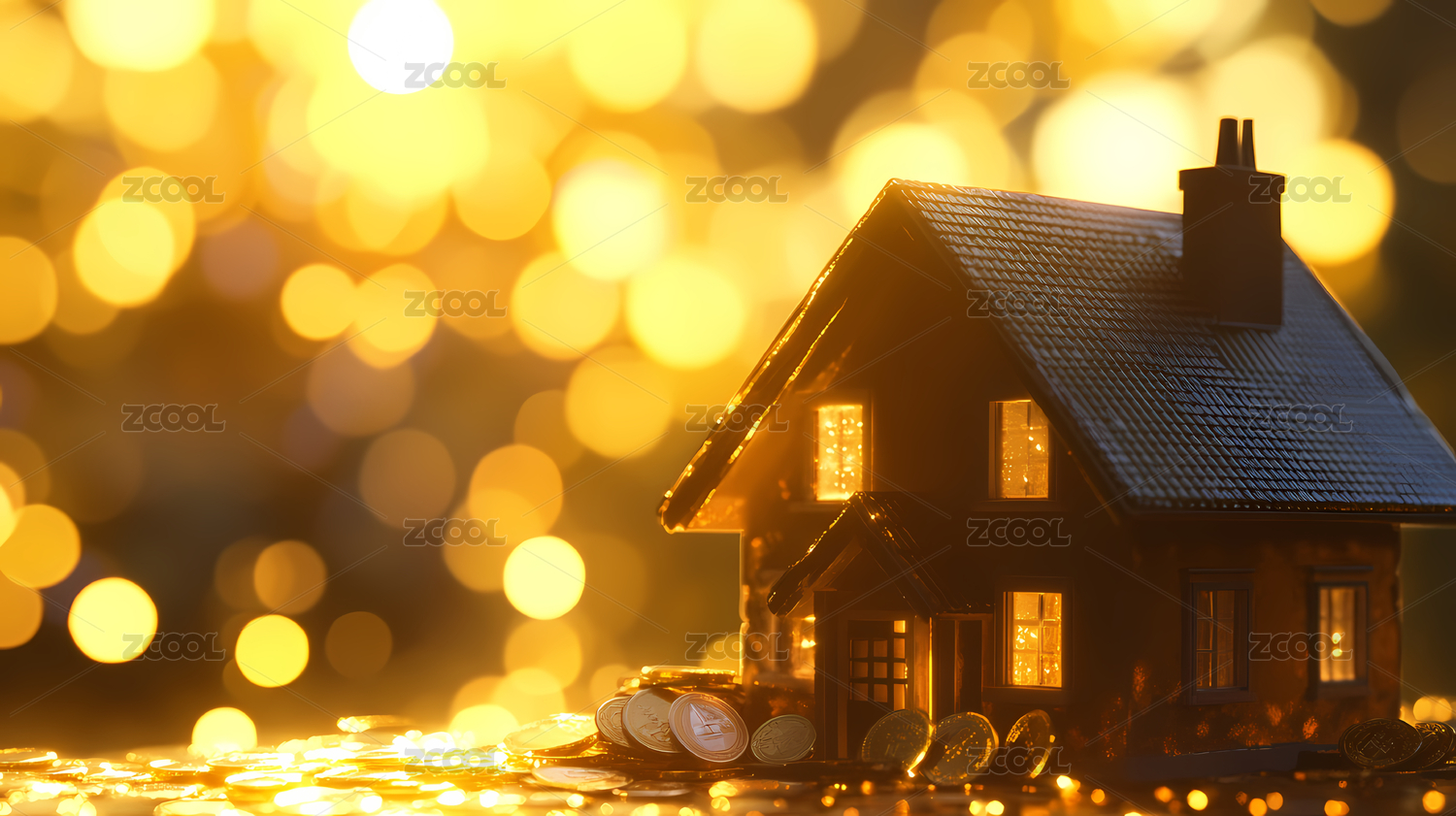 小房子模型矗立在硬币堆上,暖色