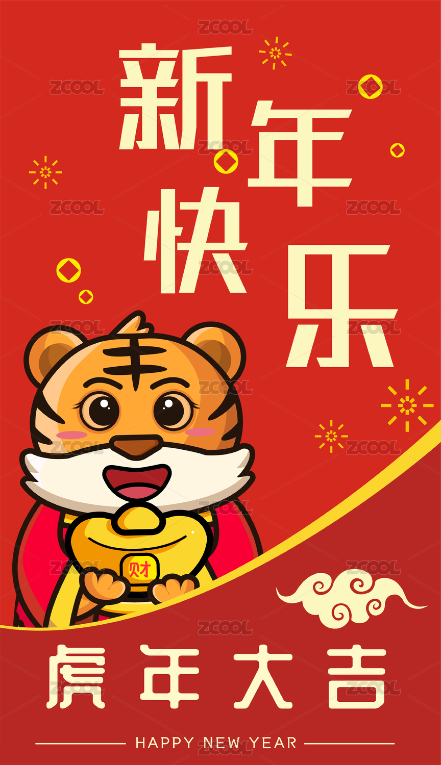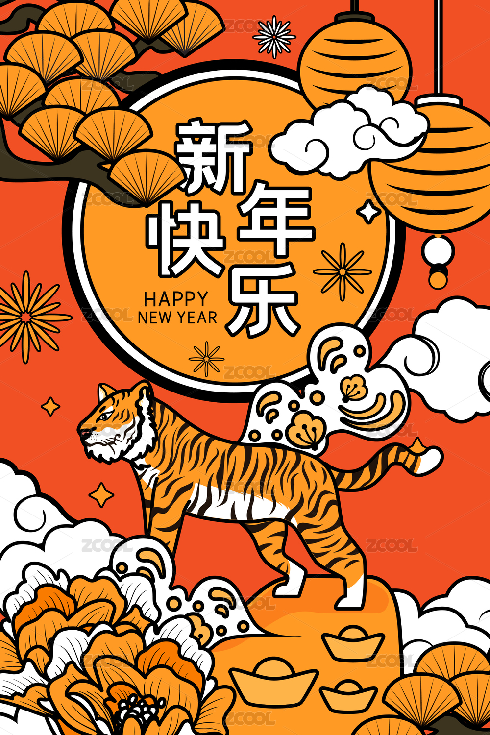 春节新年快乐老虎牡丹送福锦鲤开运国潮海报