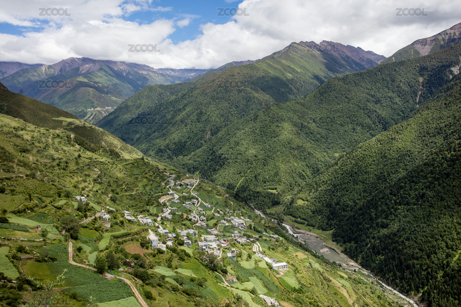 航拍山谷中的甘孜九龙县汤古镇