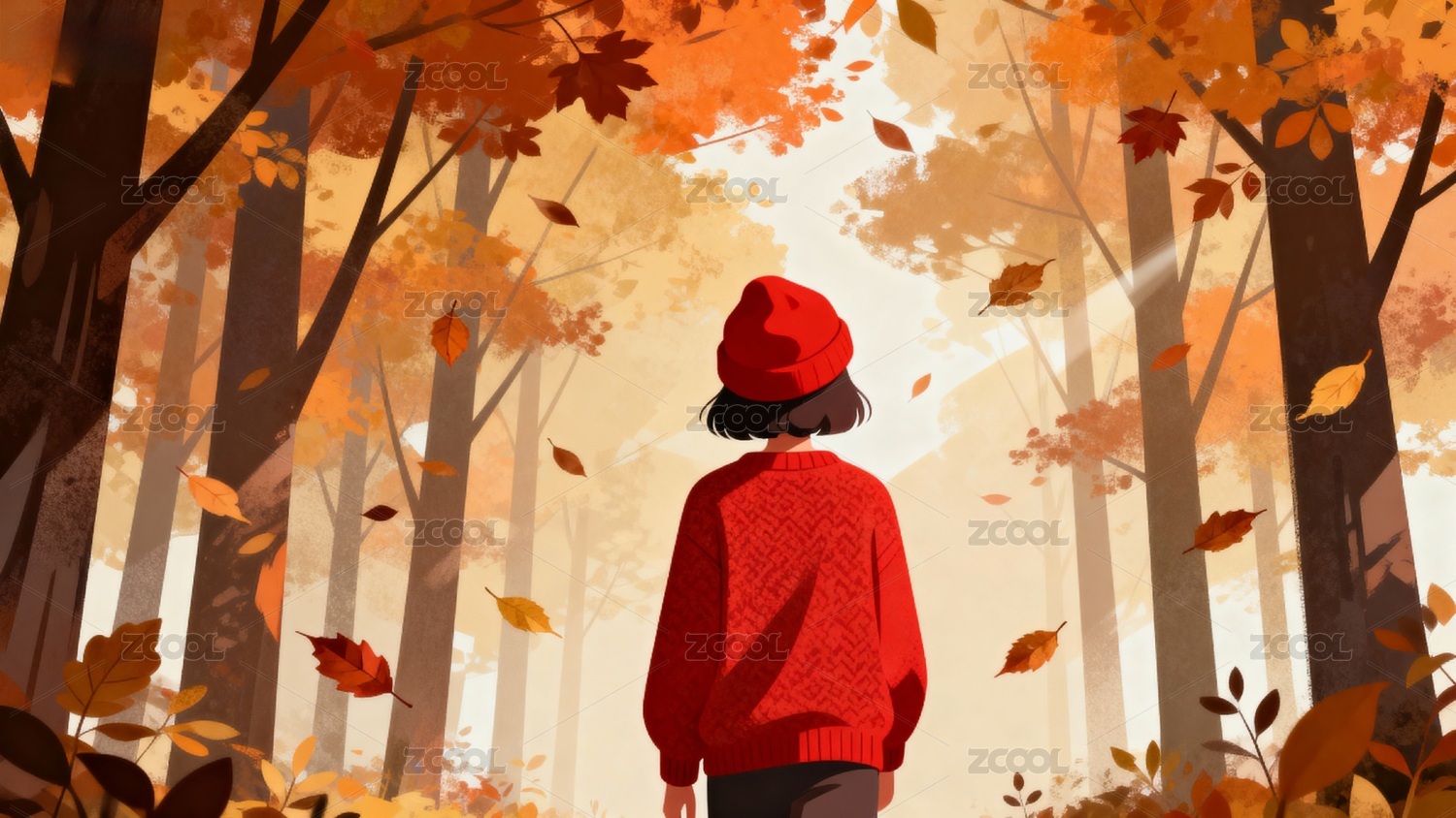 水彩风深秋公园里坐在长板凳上赏秋的人