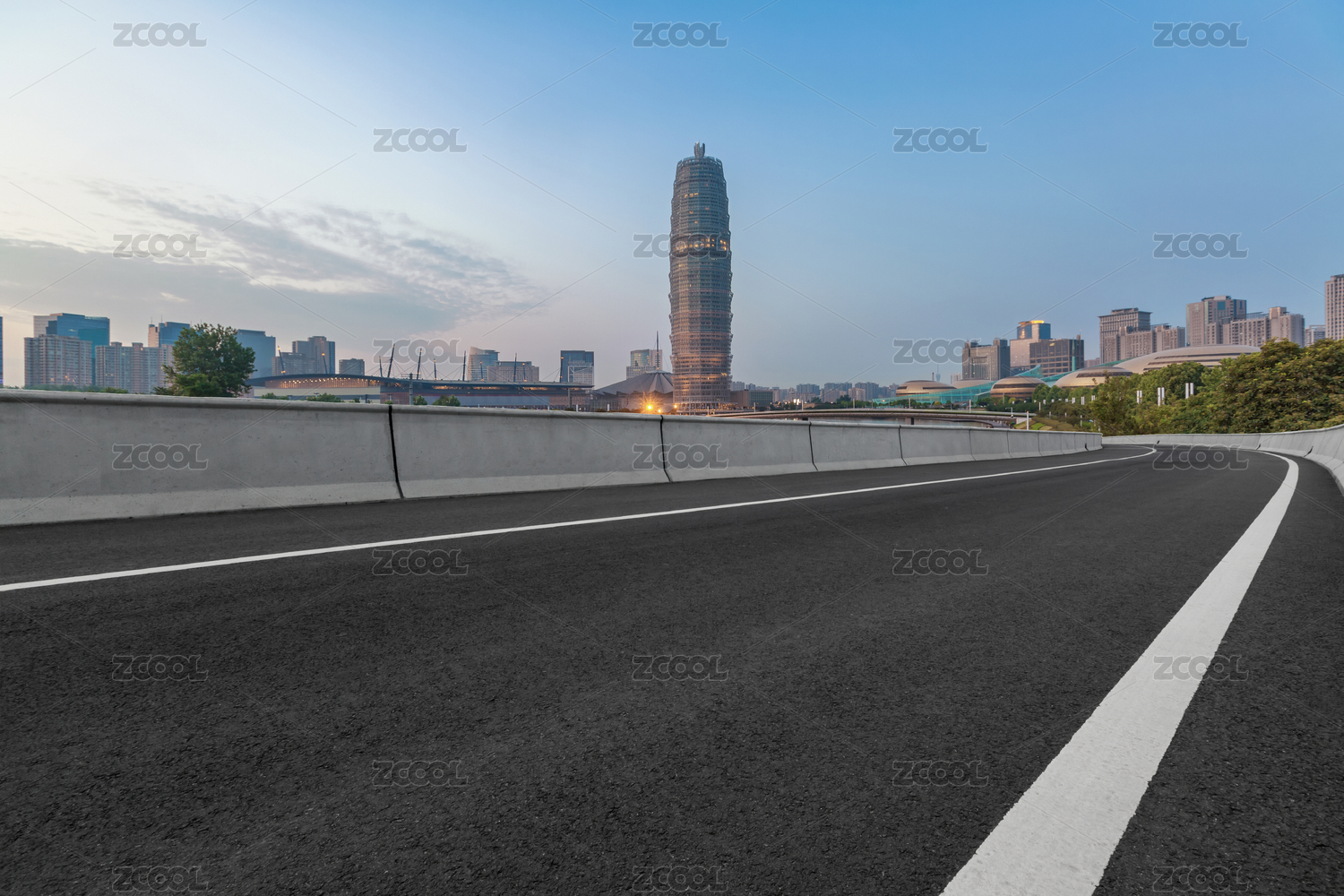 黄昏时分,前景为沥青道路的郑州城市景观和城市天际线