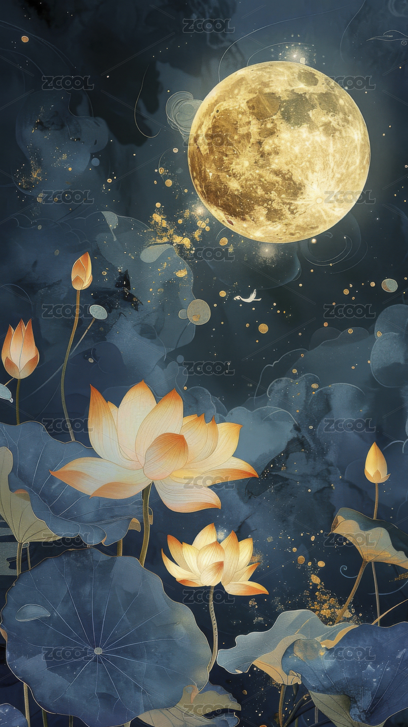 月夜莲花金光点缀唯美艺术