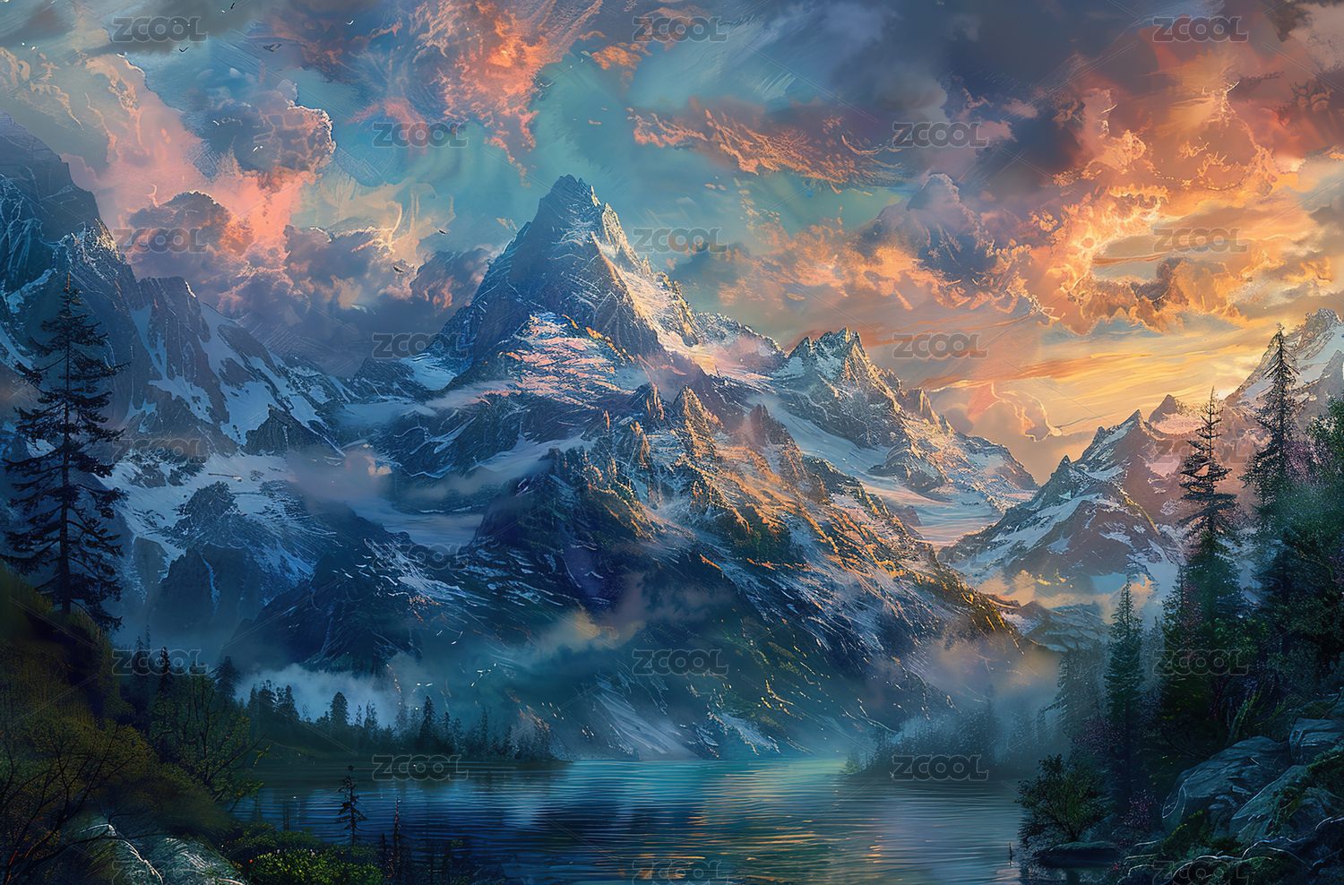 山脉,AIGC202404,高山,山脊,地形,云,雾,雪山,日照,金山