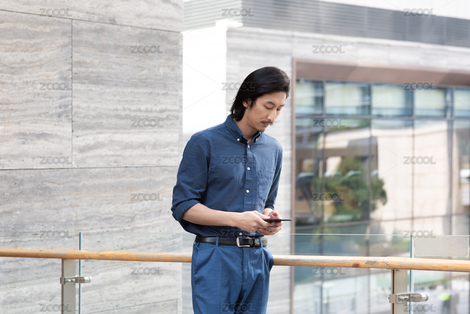 亚裔商务男士在写字楼玻璃窗旁使用手机