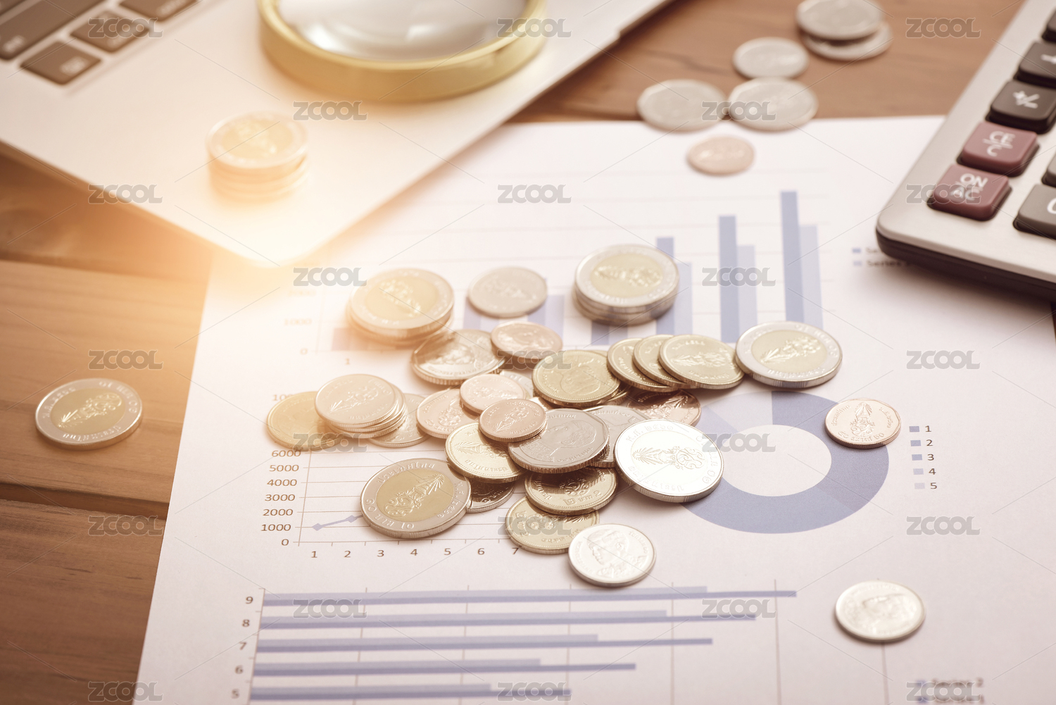 金融经济数据增长概念——放在财务数据报表分析场景上的硬币、算盘和电脑