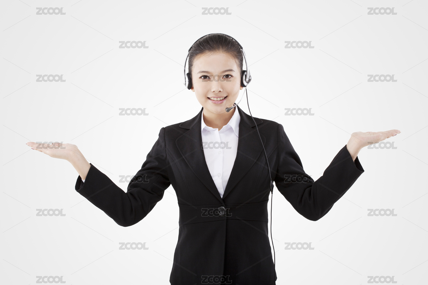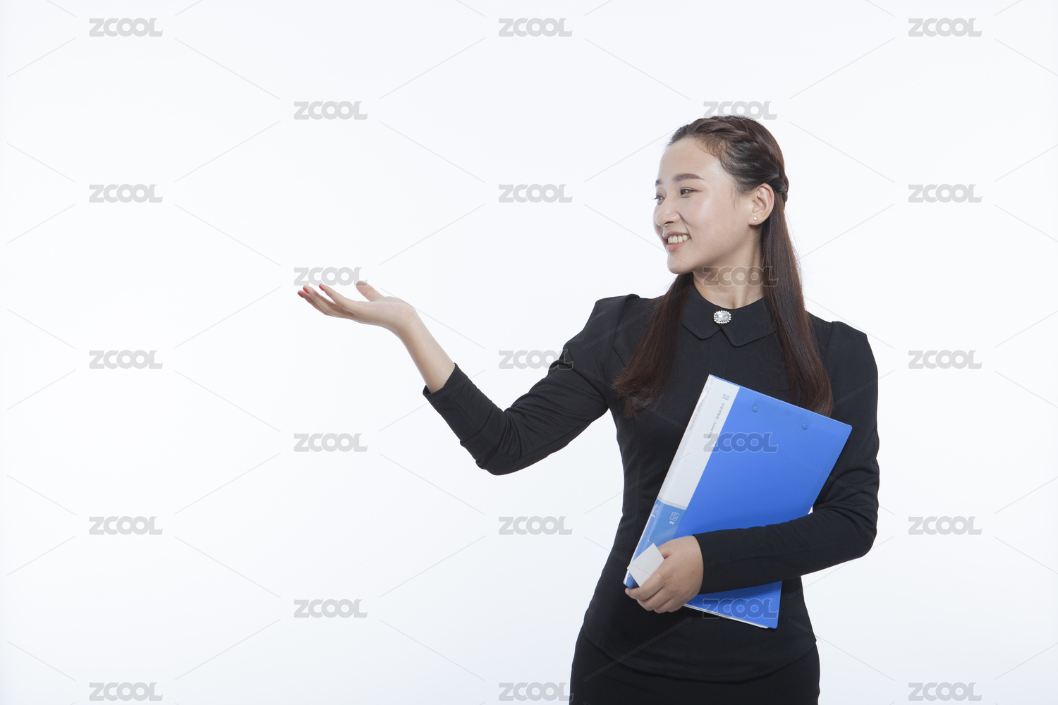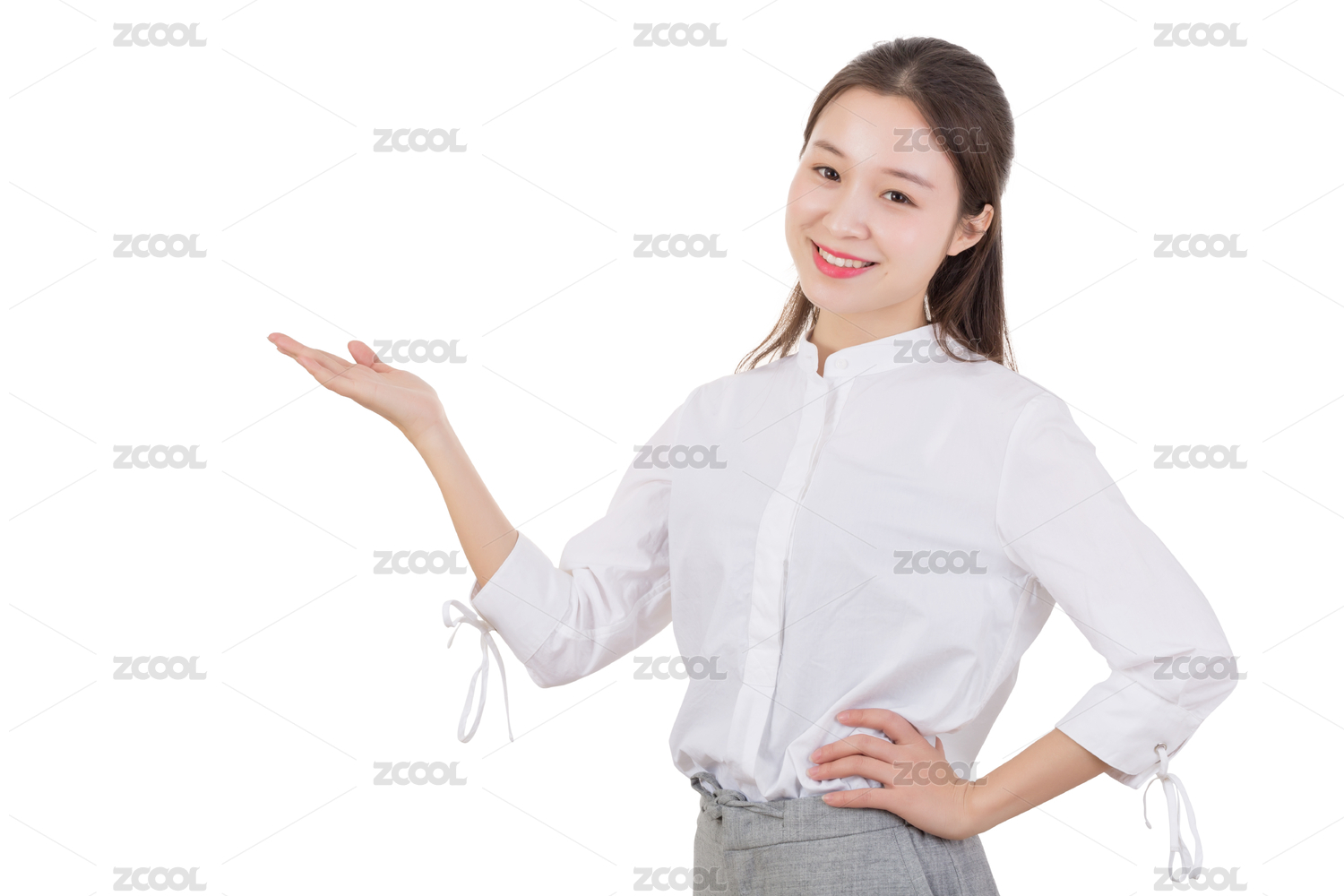白色背景下穿着正装的美女做出热情欢迎的动作
