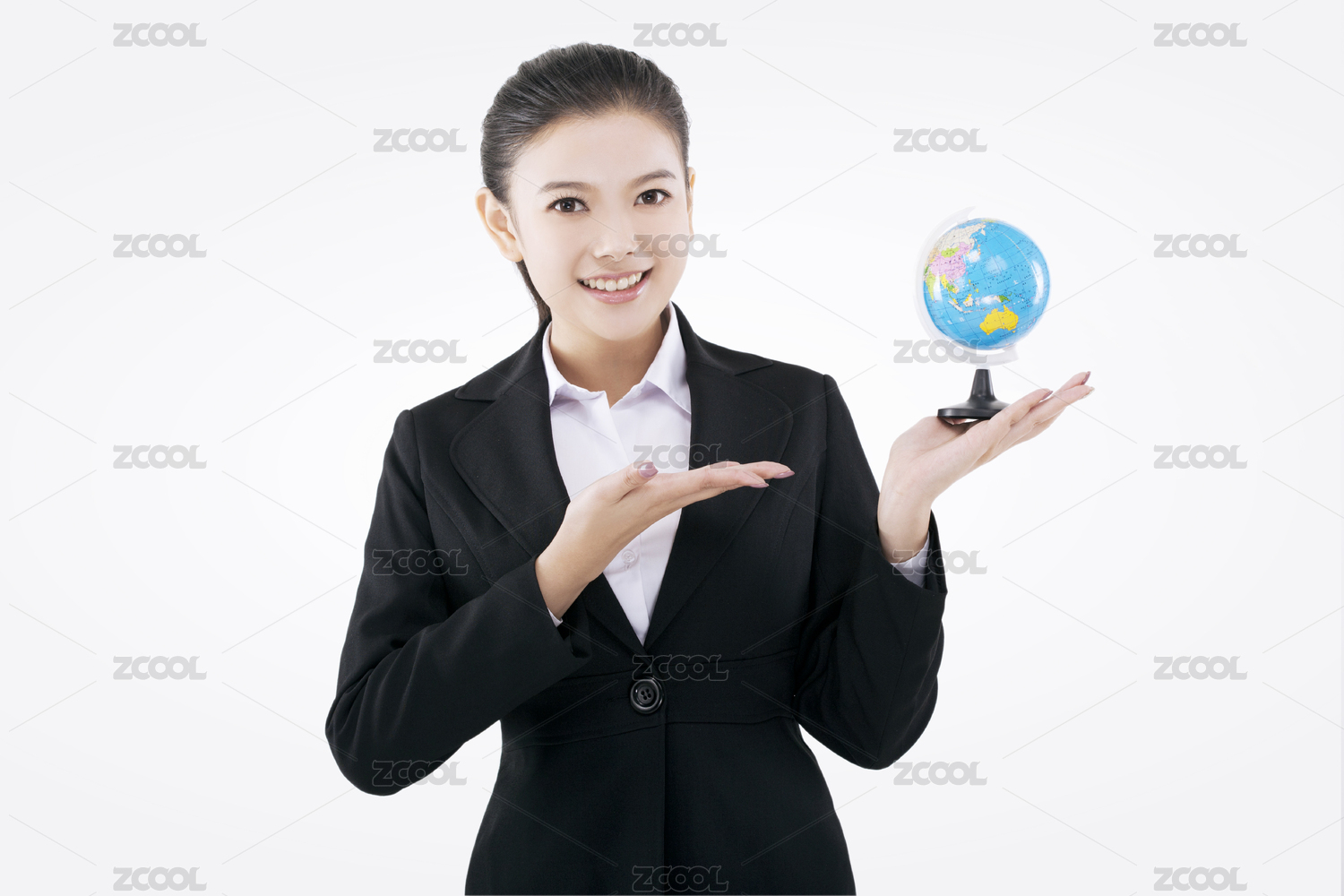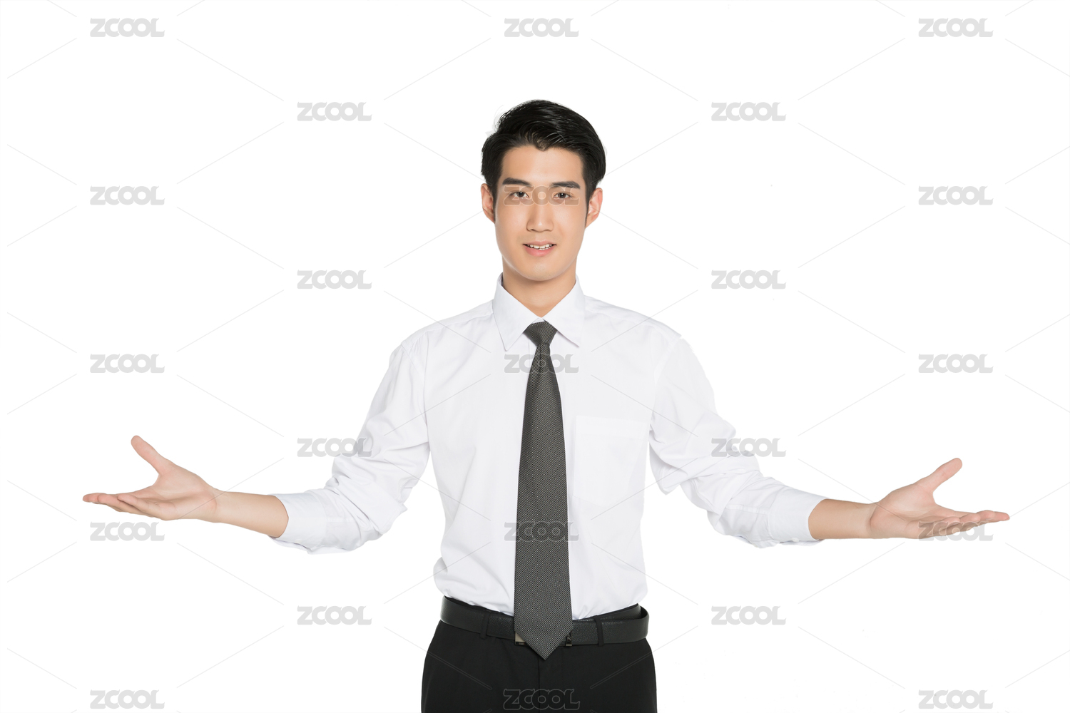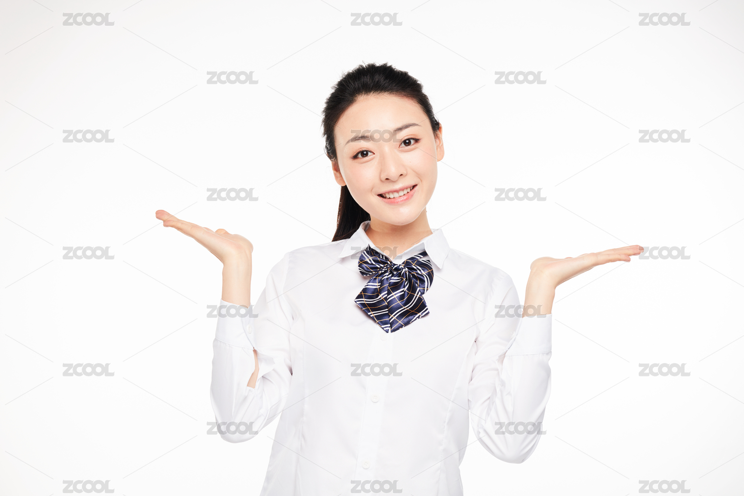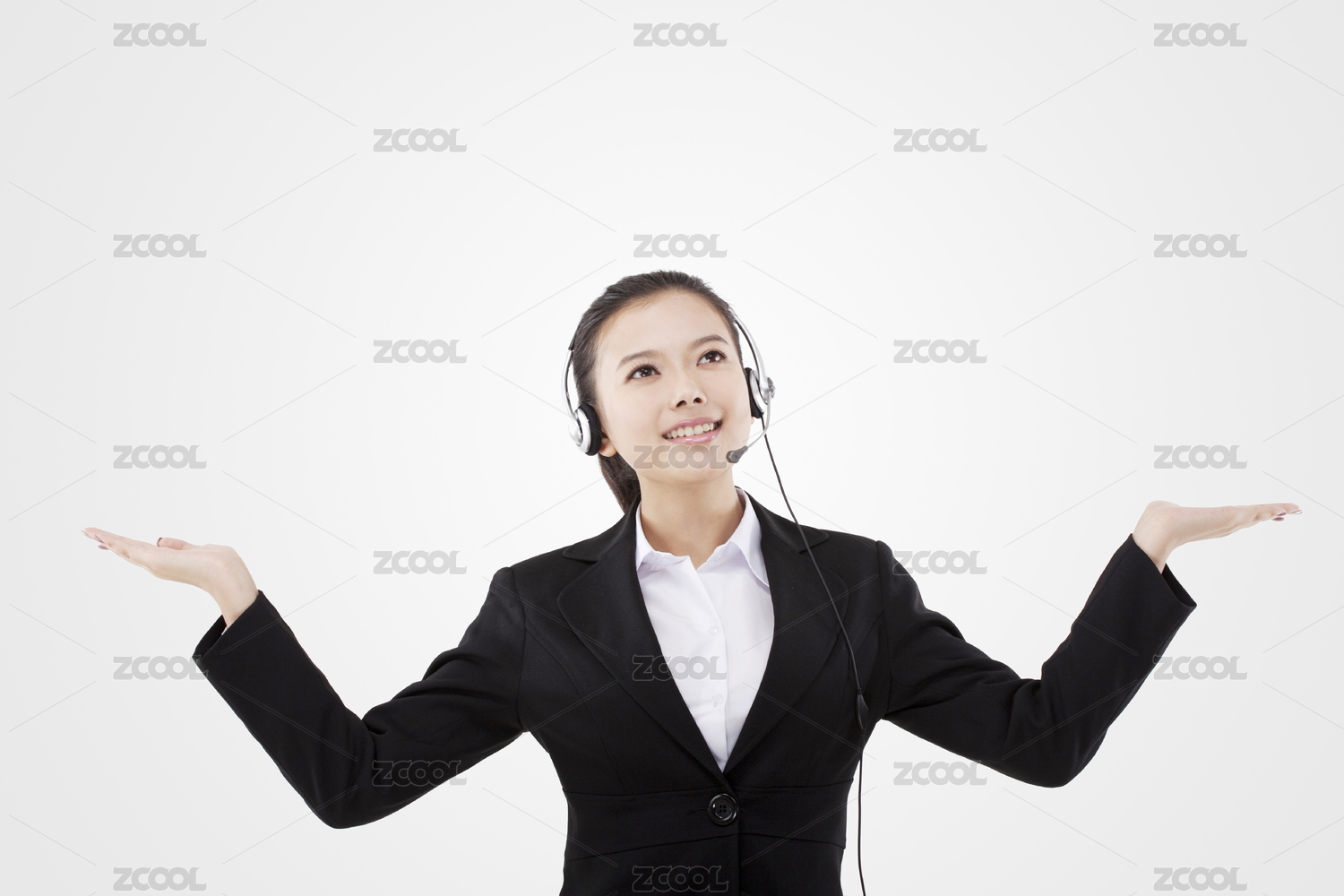 白色背景下穿着正装的美女做出热情欢迎的动作