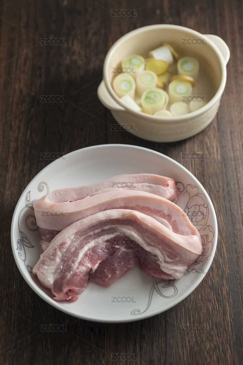 手拿菜刀正在切新鲜韭菜,旁边还摆着新鲜猪肉和空碗